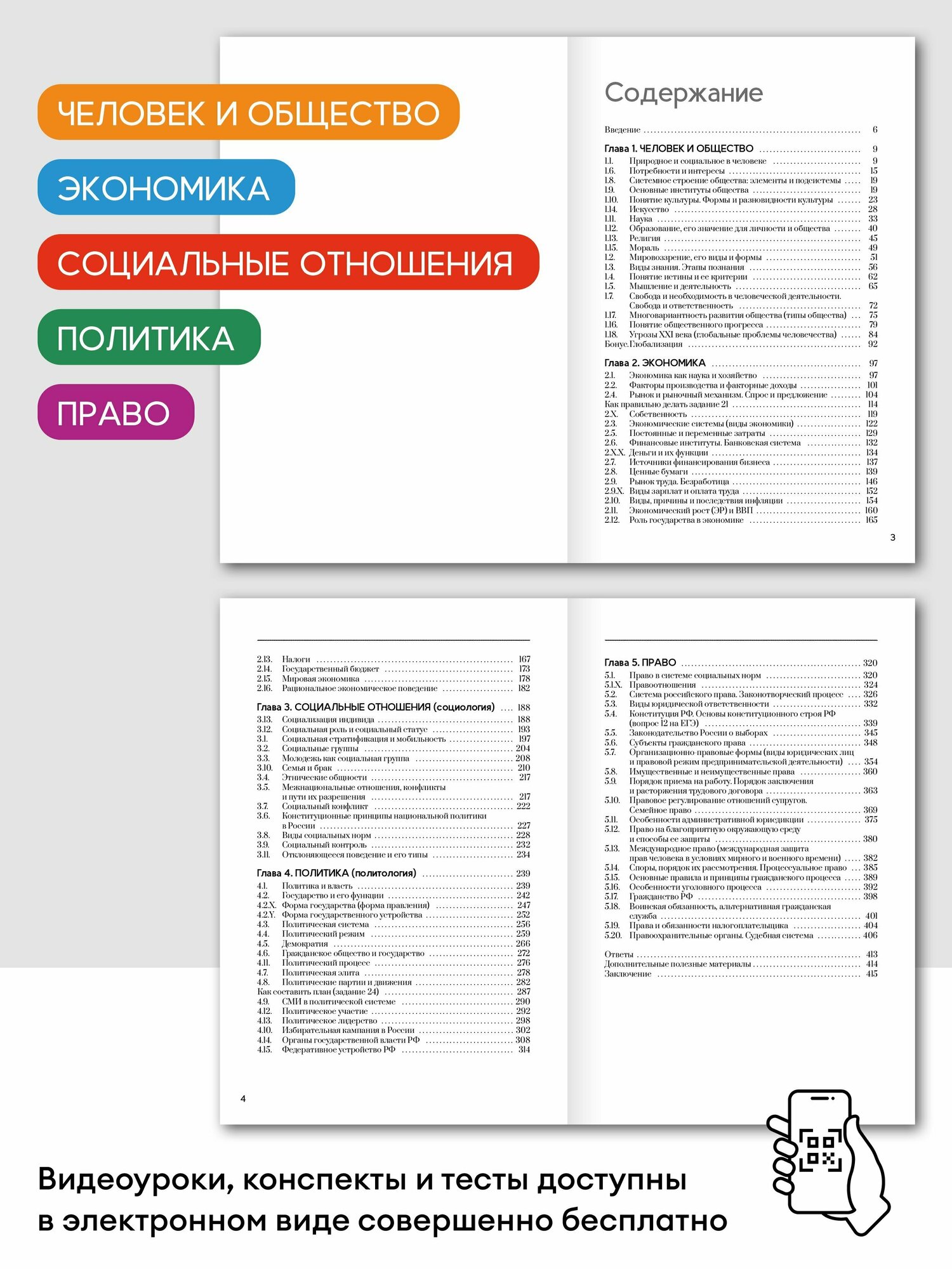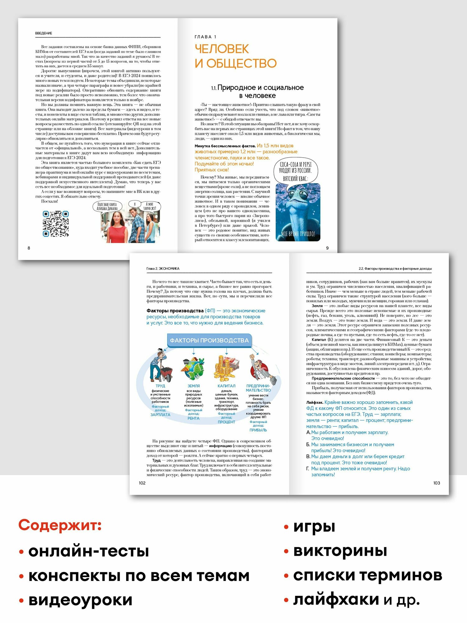 У вас в руках не просто пособие, а целый курс подготовки к ЕГЭ с учетом новых тем 2024 г., который содержит онлайн тесты и коне пекты по каждой теме, десятки видеоуроков и множество других материалов — игры, термины, законы, лайфхаки и др. Актуальные примеры, яркий дизайн, мемы и уникальный подход к объяснению сложных тем — все это поможет вам набрать максимальные баллы и полюбить обществознание.