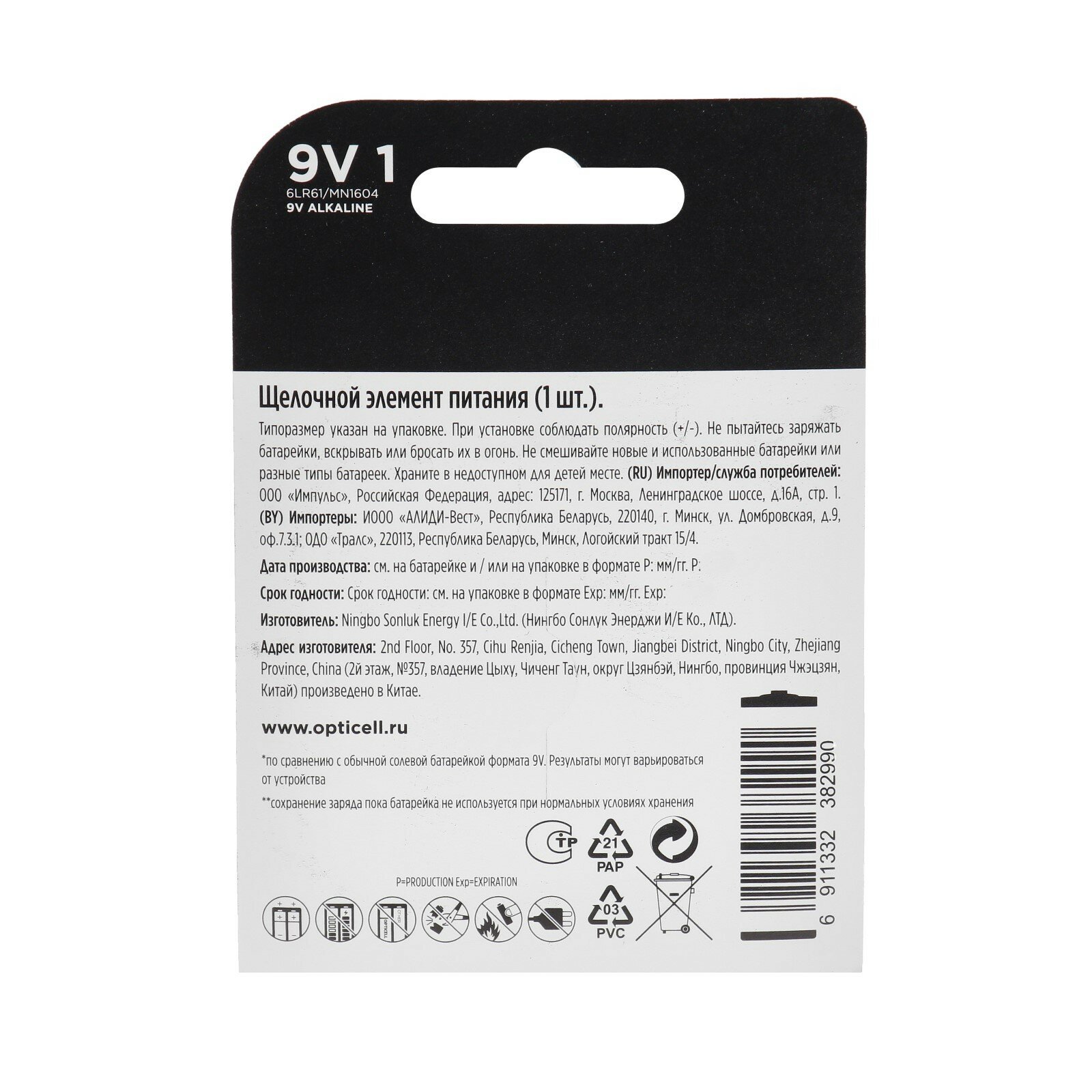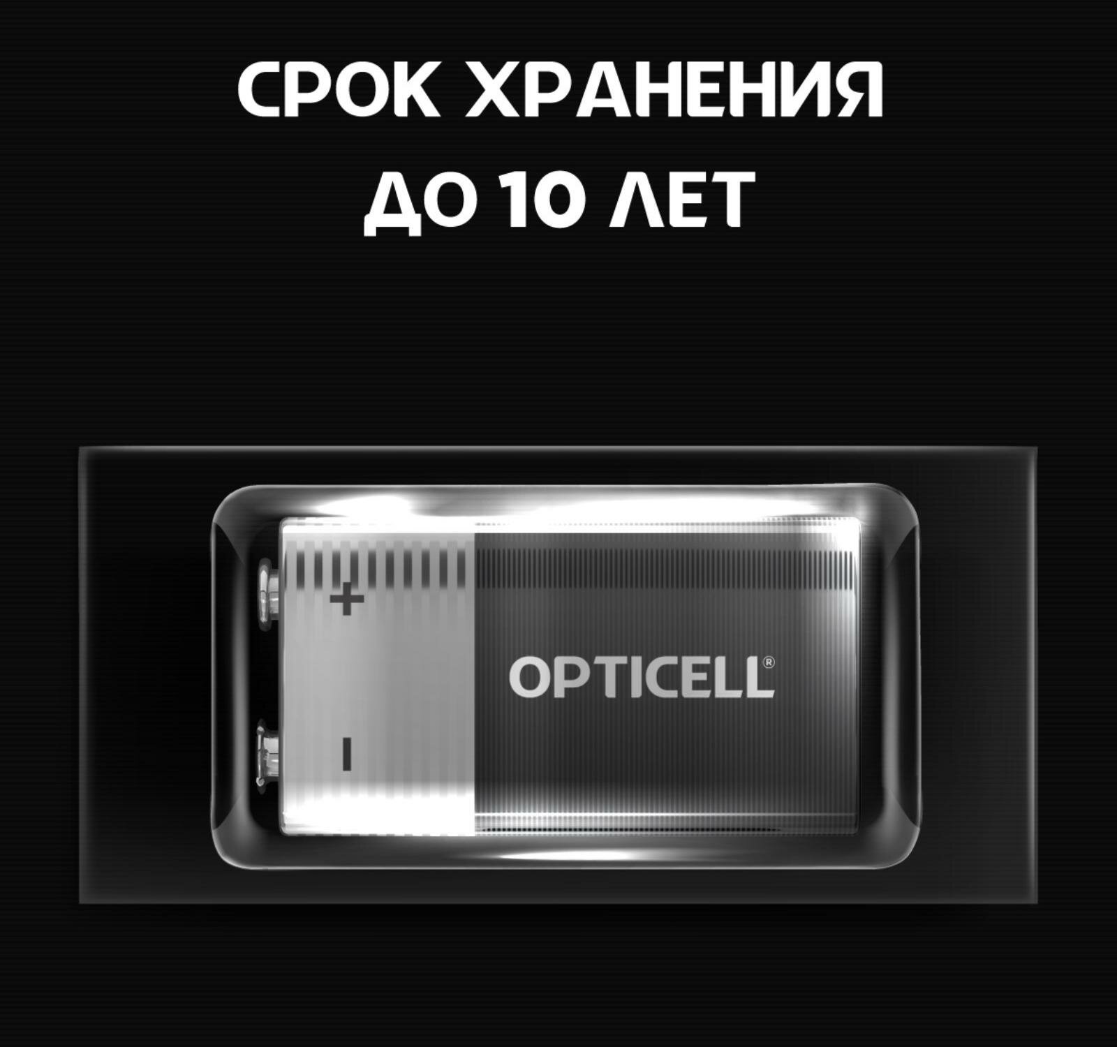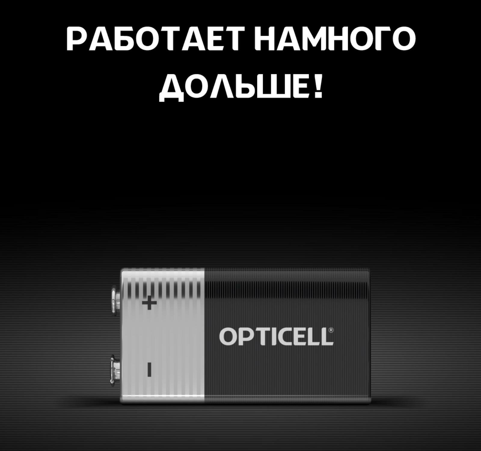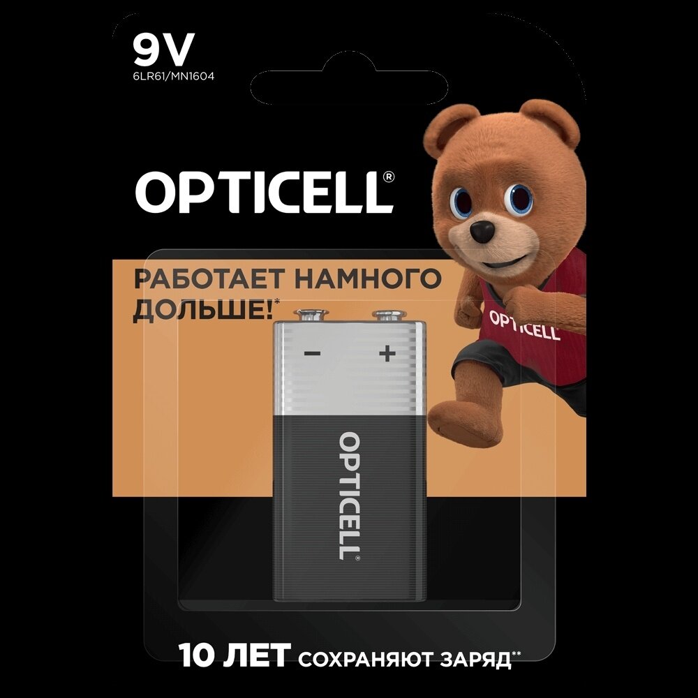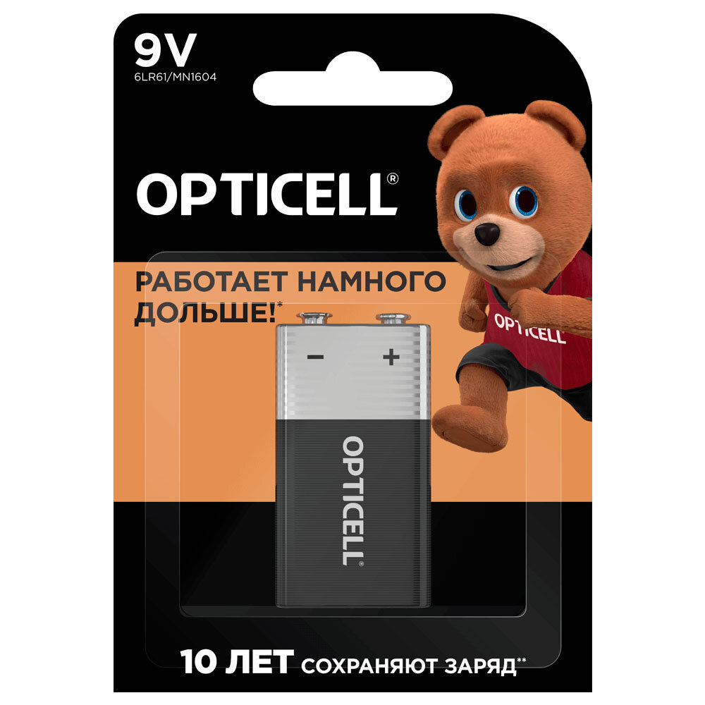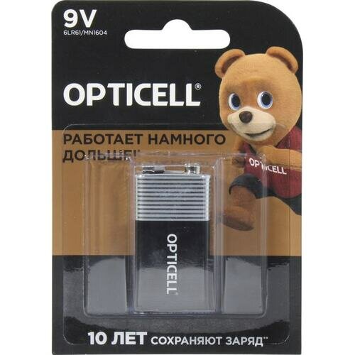 Элемент питания OPTICELL 6LR61 крона BL1. Батарейка крона 9V BL1 - надежный источник питания для часто используемых устройств, нуждающихся в дополнительной мощности. Благодаря технологии щелочных батареек, эти элементы питания обеспечивают стабильное и продолжительное питание. Типоразмер производителя "Крона" (6LR61, 6LF22, 6KR61, 1604A) гарантирует совместимость с большинством устройств, требующих питания 9V. Упаковка в виде блистера обеспечивает безопасность и удобство использования. Батарейка крона 9V обеспечивает максимальную выходную мощность 0.1 А, что позволяет использовать его в устройствах с высокими требованиями к питанию. Выбирая элемент питания OPTICELL 6LR61 крона 9V BL1, вы получаете надежный и долговечный источник питания для своих устройств.Работают намного дольше!* (*по сравнению с обычной солевой батарейкой формата 9V. Результаты могут варьироваться от устройства). Срок хранения до 10 лет* (**сохраненяет заряд пока батарейка не используется при нормальных условиях хранения).* Защита от протекания* Не содержит тяжелых металлов
