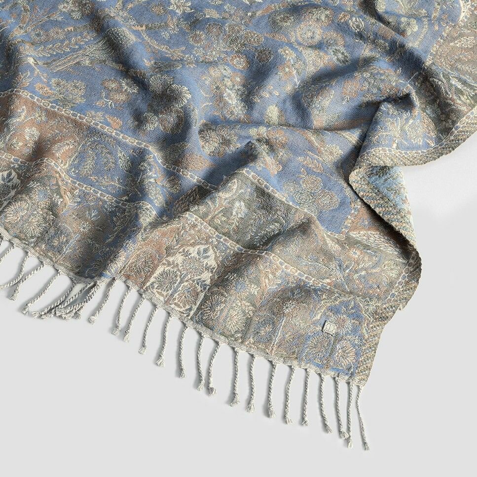 Шерстяной жаккардовый плед с этническим орнаментом., декорированный бахромой.