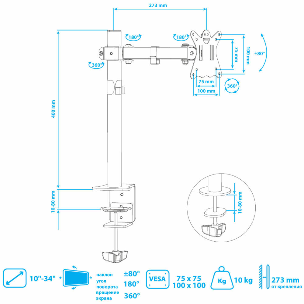 Настольный кронштейн для крепления телевизоров и мониторов KROMAX CASPER-506 надёжно удержит экран размером 10"-34" дюйма и весом 10 кг.Наклонно-поворотная регулировка позволит вращать экран на 360°, наклонять вверх и вниз на ±80°, и поворачивать влево и вправо на 180° – для оптимального угла зрения и удобной посадки.KROMAX CASPER-506 имеет настольный тип установки с механизмом защиты от падения.Крепёжные отверстия настольного кронштейна KROMAX CASPER-506 изготовлены по международному стандарту VESA.Кронштейн подходит для большинства мониторов популярных брендов, среди которых Samsung, LG, Sony, Panasonic, Sharp, Toshiba, Dell, ASUS, HP, Acer, BenQ, MSI, Philips, Lenovo, Sceptre, ViewSonic, Gigabyte, AOC, Viotek и других.В комплектацию KROMAX CASPER-506 входят необходимые для монтажа материалы.Вся продукция обеспечивается гарантийными обязательствами.
