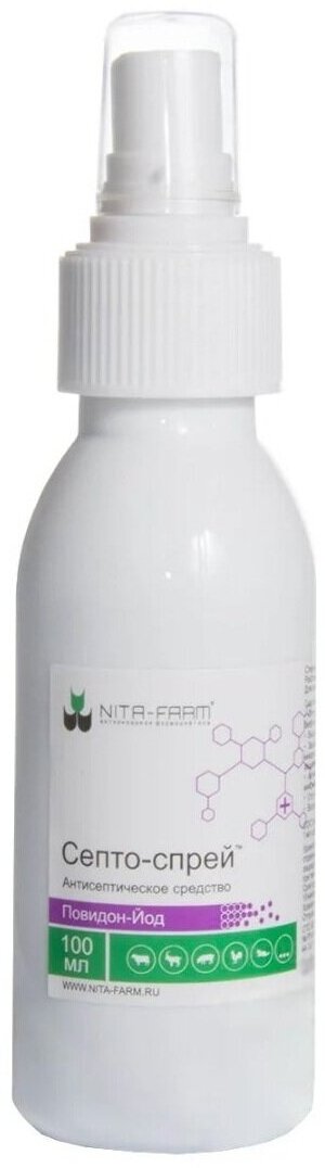 Септо-спрей (Septo-Spray) – раствор для наружного применения для лечения заболеваний кожи, слизистых оболочек и обработки операционного поля у животных. Септо-спрей представляет собой прозрачную слегка вязкую жидкость коричневого цвета со слабым запахом йода.составВ качестве действующего вещества 0,03 г йодоповидона (0,3% активного йода), а также вспомогательные вещества: глицерин - 50 мг, кислоты лимонной моногидрат - 7 мг, натрий фосфорнокислый двухзамещенный 12-водный - 16,1 мг и вода для инъекции до 1 мл.побочные действияСепто-спрей не вызывает у животных побочных явлений и осложнений при применении в соответствии с настоящей инструкцией.срок годности И храненияХранят Септо-спрей с предосторожностью (список Б) в упаковке производителя в сухом, защищенном от света месте при температуре от 0°С до 25°С.Срок годности при указанных условиях хранения – 18 месяцев со дня изготовления. Запрещается использовать лекарственное средство по истечении срока годности.упаковкаВыпускают Септо-спрей в форме стерильного раствора, расфасованным по 100 мл в полимерные флаконы соответствующей вместимости с навинчиваемыми крышками, оснащенными спрей-насадками или распылителями.