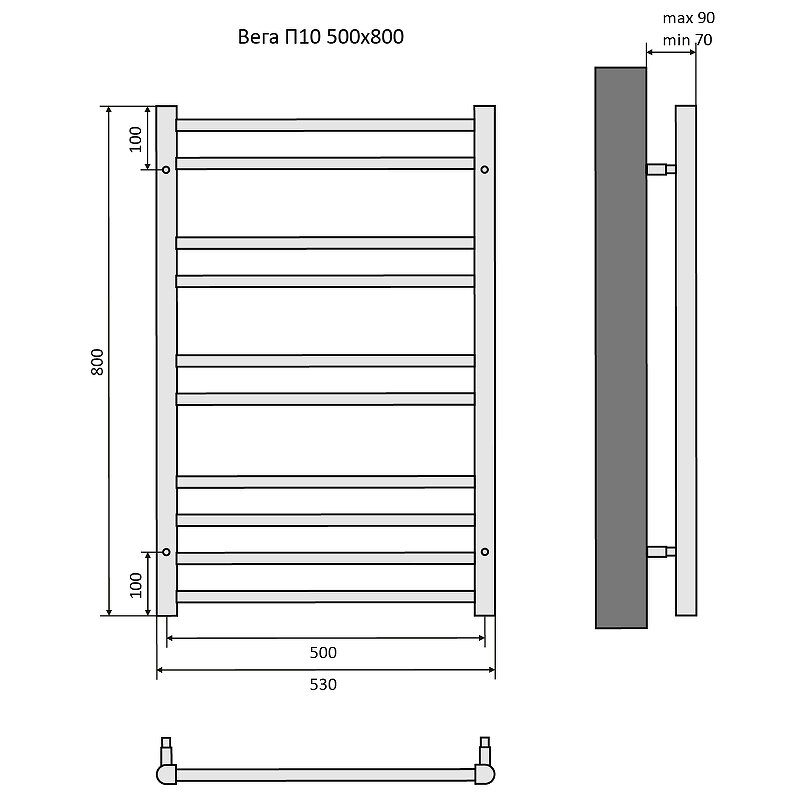 Полотенцесушитель водяной Aquatek (Акватек) Вега П10 500х800 мм, подключение нижнее/диагональное, сверхпрочная пищевая нержавеющая сталь AISI 304L, гарантия 10 лет