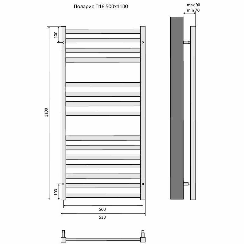 Полотенцесушитель водяной Aquatek (Акватек) П16 500х1100 мм, подключение нижнее/диагональное, сверхпрочная пищевая нержавеющая сталь AISI 304L, гарантия 10 лет