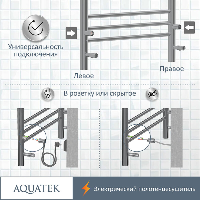Стильный и функциональный полотенцесушитель Aquatek станет идеальным решением для вашей ванной комнаты, обеспечивая комфорт и уют. Полотенцесушитель Aquatek можно использовать не только для сушки белья, но и для обогрева небольшого помещения, что делает его незаменимым аксессуаром в любой ванной комнате.