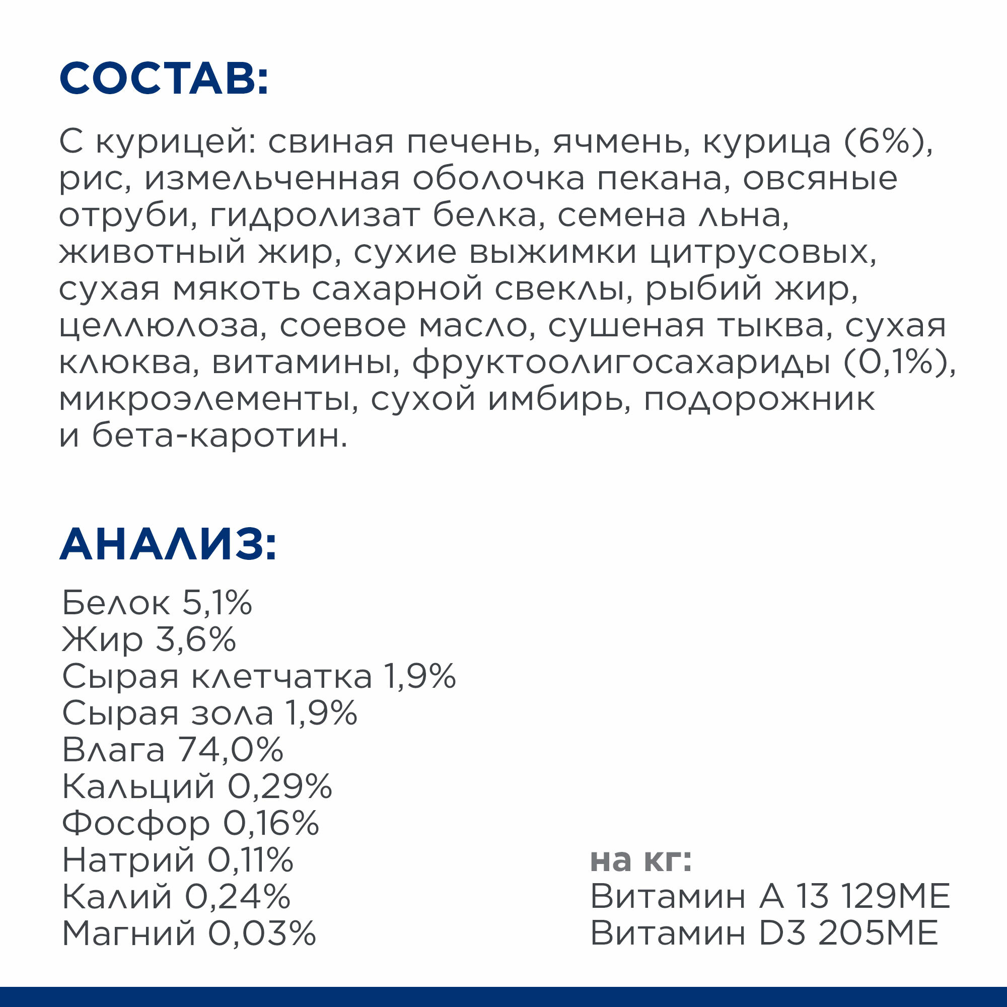Мясо и производные животного происхождения (курица 6%), злаки, производные растительного происхождения, масла и жиры, минералы, фрукты, семена, овощи. Легкопереваримые ингредиенты: Свиная печень, курица, рис, животный жир, рыбий жир, растительное масло. Смесь пребиотиков ActivBiome+ (3,2%): Измельченная оболочка пекана, семя льна, сухие выжимки цитрусовых, сухая мякоть сахарной свеклы, сухая клюква.