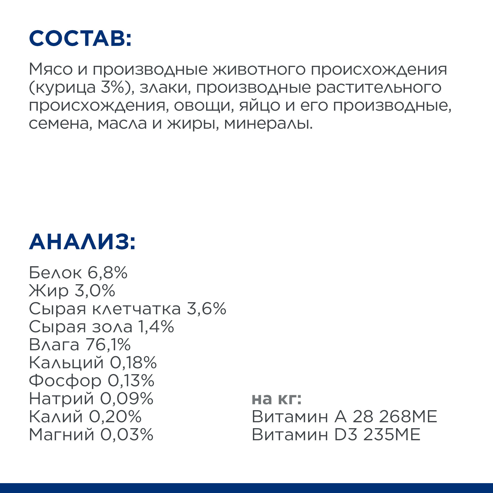 Даже небольшой лишний вес влияет на качество жизни собаки: ухудшается общее состояние здоровья, остаётся меньше сил на игры, собака становится менее подвижной, увеличивается риск заболеваний, связанных с избыточным весом. Диетологи и ветеринарные специалисты Hill's разработали Prescription Diet Metabolic - диетический корм, созданный для лёгкого снижения и контроля веса с учётом всех потребностей собак. Этот корм помогает вашей собаке сжигать жир и дает энергию для активных игр. С уникальной смесью клетчатки собаки всегда сыты и довольны между кормлениями. 96% собак успешно снизили вес в домашних условиях за 2 месяца с Hill's Prescription Diet Metabolic. Попробуйте влажный корм с курицей с великолепным вкусом, который понравится вашей собаке. ? Уникальная смесь клетчатки помогает собакам чувствовать себя сытыми и довольными в перерывах между кормлениями ? Поддерживает естественную способность организма сжигать жирHill's Prescription Diet Metabolic влажный диетический корм обеспечивает собаку необходимыми нутриентами для снижения и контроля веса. Подходит для постоянного кормления, помогает легко и эффективно снизить вес собаки. Ветеринарный специалист может дополнительно рассказать, как Hill's Prescription Diet помогает собакам наслаждаться счастливой и активной жизнью. Можно смешивать сухой и влажный корм и кормить им одновременно.Не рекомендуется: щенкам, беременным или кормящим собакам.