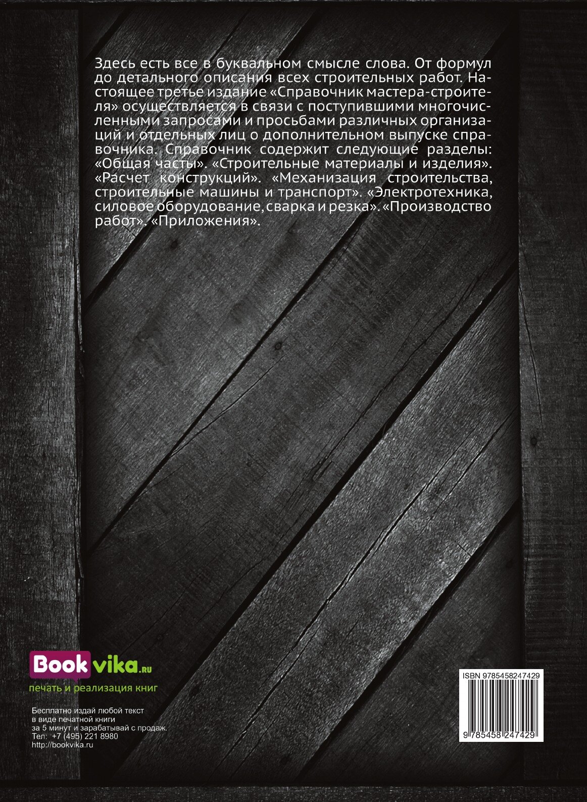 Здесь есть все в буквальном смысле слова. От формул до детального описания всех строительных работ.Настоящее третье издание «Справочник мастера-строителя» осуществляется в связи с поступившими многочисленными запросами и просьбами различных организаций и отдельных лиц о дополнительном выпуске справочника.Справочник содержит следующие разделы: «Общая часты». «Строительные материалы и изделия». «Расчет конструкций». «Механизация строительства, строительные машины и транспорт». «Электротехника, силовое оборудование, сварка и резка». «Производство работ». «Приложения».