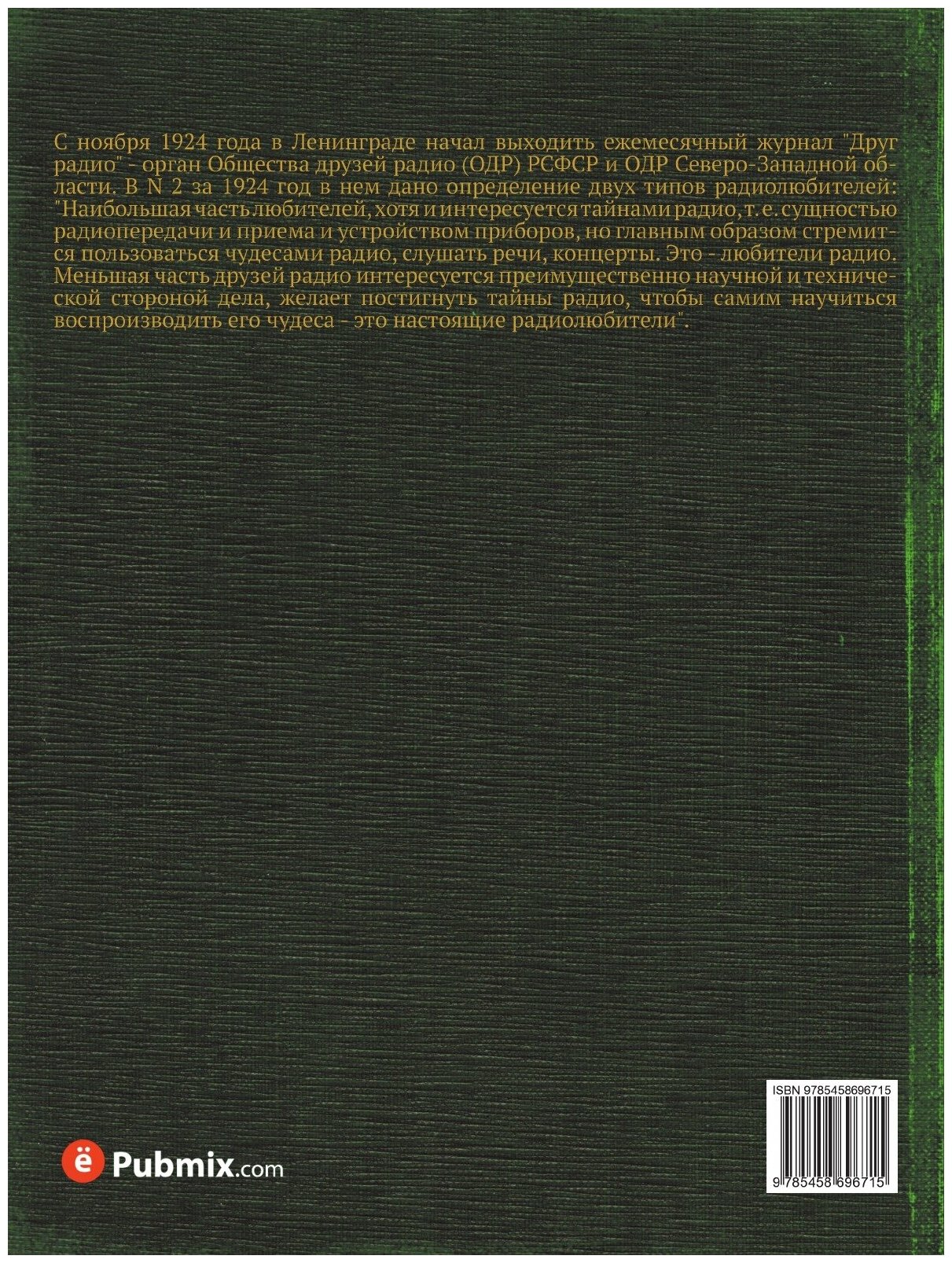 Эта книга - репринт оригинального издания (издательство "Ленинград: Издательство журнала "Радио", 1926 год), созданный на основе электронной копии высокого разрешения, которую очистили и обработали вручную, сохранив структуру и орфографию оригинального издания. Редкие, забытые и малоизвестные книги, изданные с петровских времен до наших дней, вновь доступны в виде печатных книг.С ноября 1924 года в Ленинграде начал выходить ежемесячный журнал "Друг радио" - орган Общества друзей радио (ОДР) РСФСР и ОДР Северо-Западной области. В N 2 за 1924 год в нем дано определение двух типов радиолюбителей: "Наибольшая часть любителей, хотя и интересуется тайнами радио, т. е. сущностью радиопередачи и приема и устройством приборов, но главным образом стремится пользоваться чудесами радио, слушать речи, концерты. Это - любители радио. Меньшая часть друзей радио интересуется преимущественно научной и технической стороной дела, желает постигнуть тайны радио, чтобы самим научиться воспроизводить его чудеса - это настоящие радиолюбители".Издательство ЁЁ Медиа. ЖурналыМягкий переплетОбъем - 46 стр.Формат - 210x280 мм.ISBN 978-5-458-69671-5Год издания: 2013