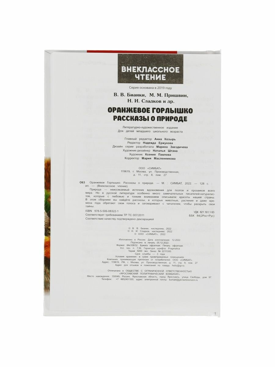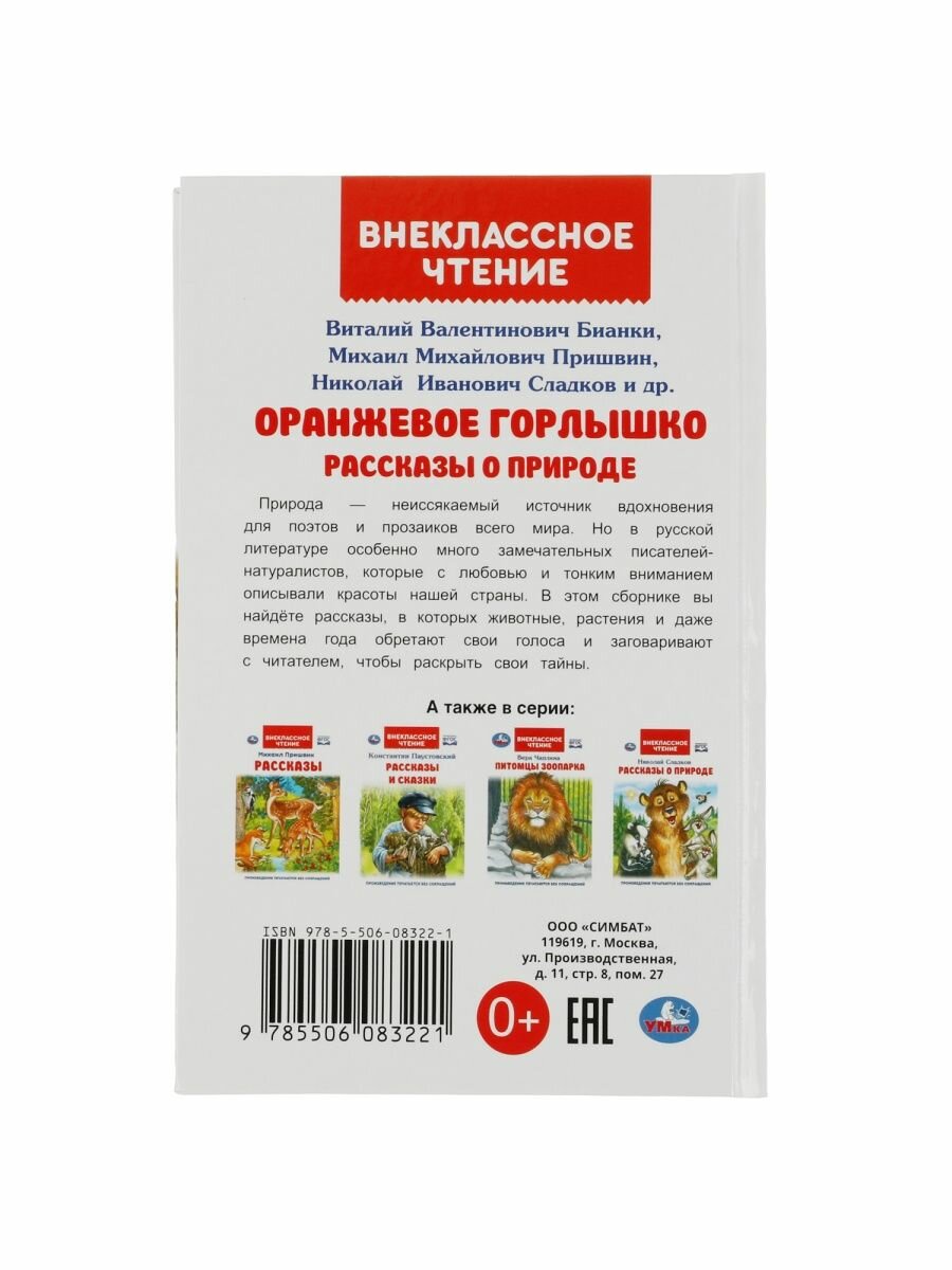 Книга «Оранжевое Горлышко. Рассказы о природе» из серии «Внеклассное чтение» ТМ «УМка» - отличный вариант для самостоятельного чтения вне занятий в школе:- произведения печатаются без сокращений- увлекательный сюжет- яркие крупные картинки- крупный шрифт- твёрдый переплёт- удобный формат- соответствует ФГОСПрирода — неиссякаемый источник вдохновения для поэтов и прозаиков всего мира. Но в русской литературе особенно много замечательных писателей-натуралистов, которые с любовью и тонким вниманием описывали красоты нашей страны: В. В. Бианки, М. М. Пришвин, Н. И. Сладков, К. Д. Ушинский, К. Г. Паустовский, Д. Н. Мамин-Сибиряк. В этом сборнике юный читатель найдёт рассказы, в которых животные, растения и даже времена года обретают свои голоса и заговаривают с ним, чтобы раскрыть свои тайны. Наличие цветных иллюстраций сделает чтение этих историй ещё более интересным. Благодаря компактному размеру книгу удобно брать с собой в поездки.Чтение книг из серии «Внеклассное чтение» ТМ «УМка» расширяет кругозор и развивает:- образное мышление- визуальное восприятие- внимание- память- речьОбъём: 128 стр. Формат: 125 х 195 мм (А5).Материал: офсетная бумага.Рекомендовано детям младшего школьного возраста.