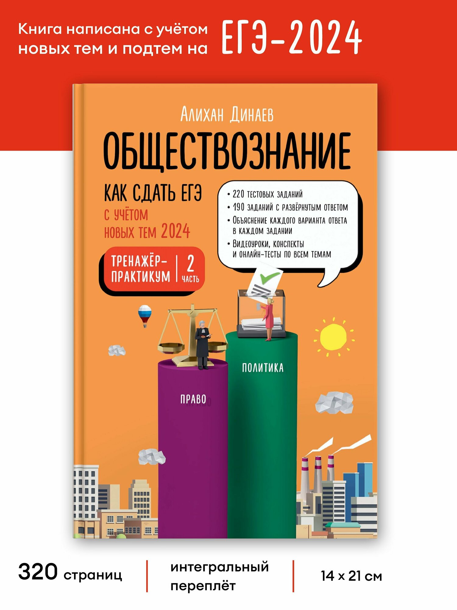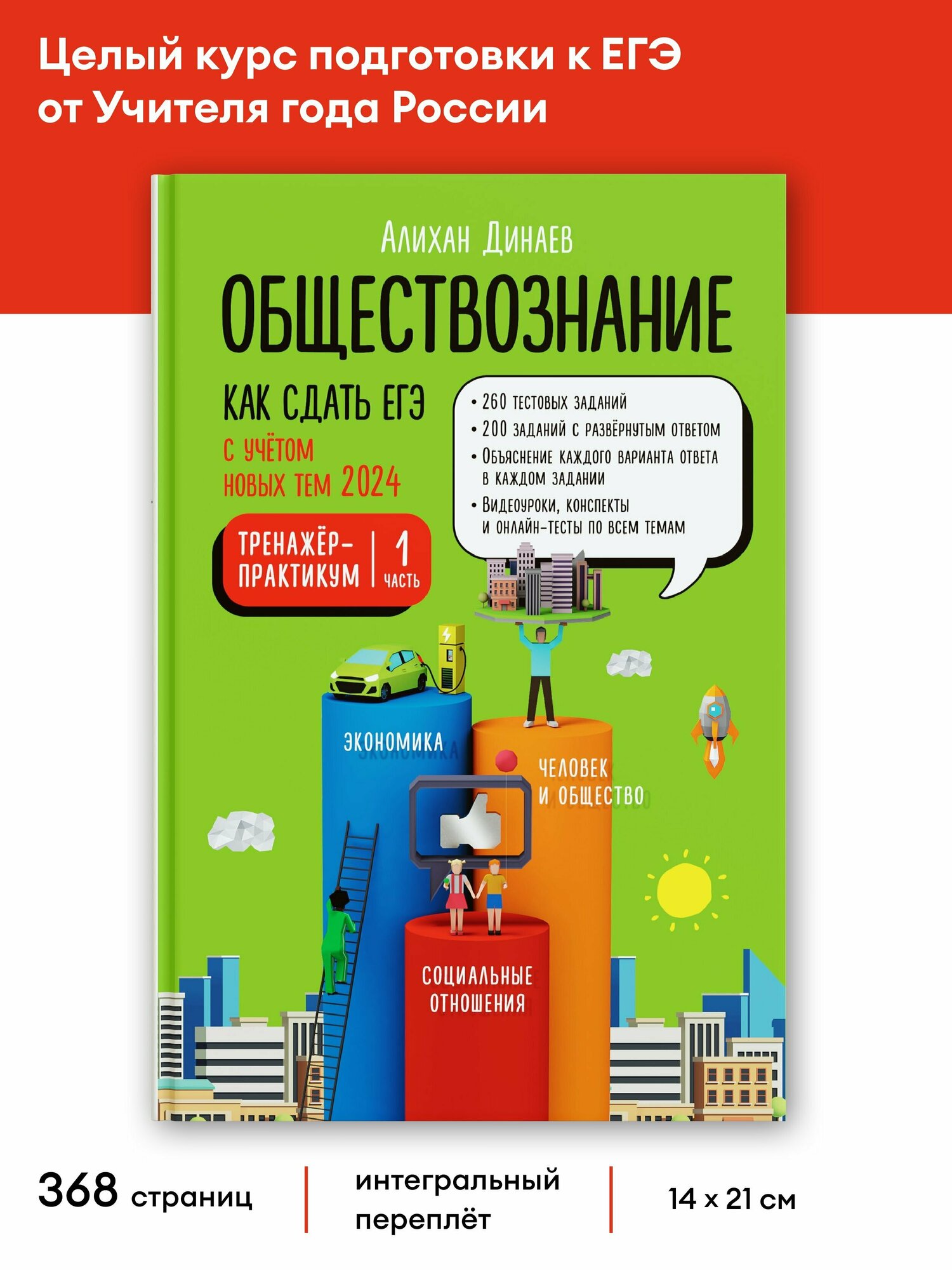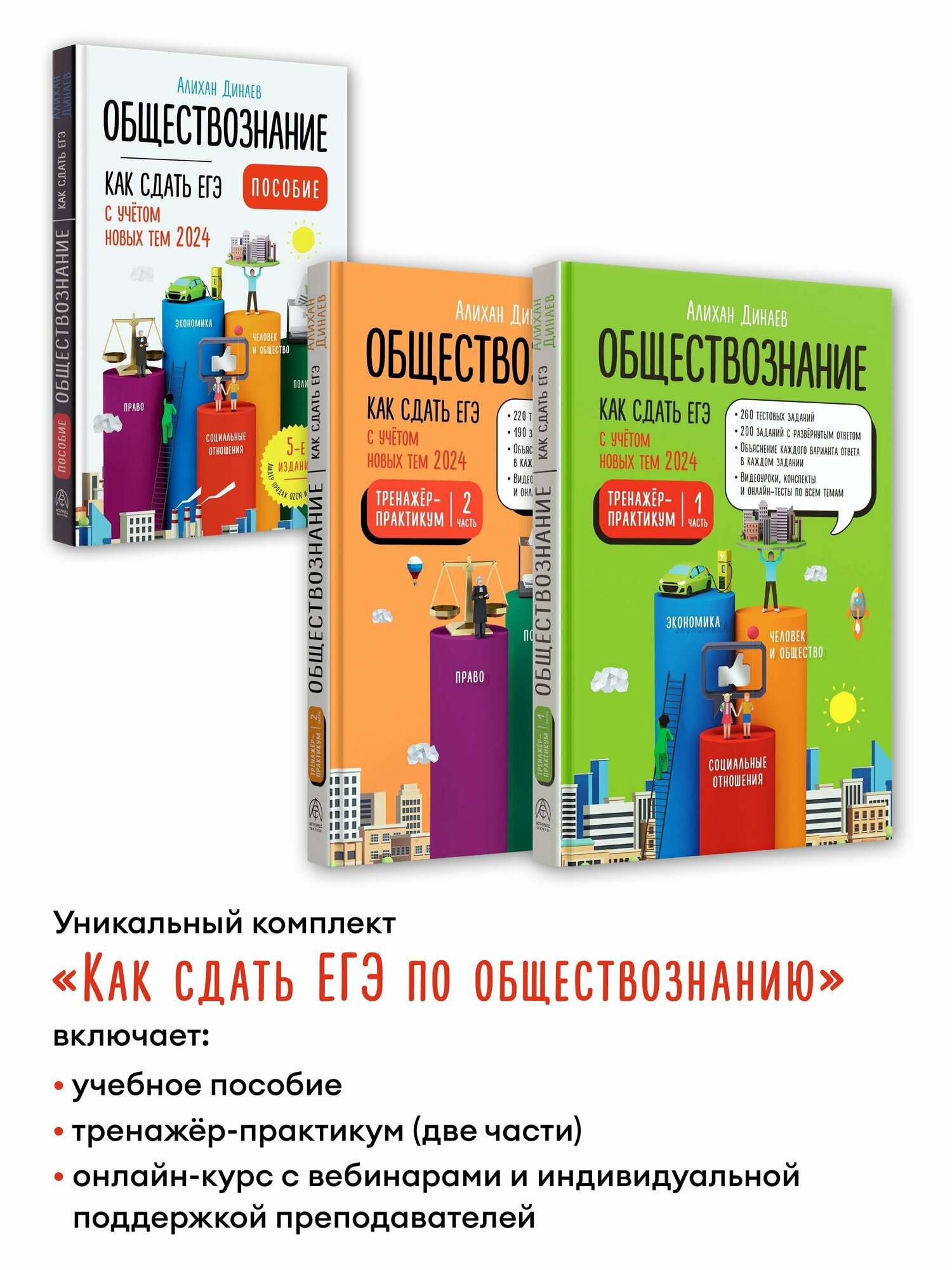 Уникальный комплект «Как сдать ЕГЭ по обществознанию» включает в себя учебное пособие, две части тренажера-практикума и онлайн-курс от Алихана Динаева с вебинарами, индивидуальной поддержкой от преподавателей и помощью искусственного интеллекта.
