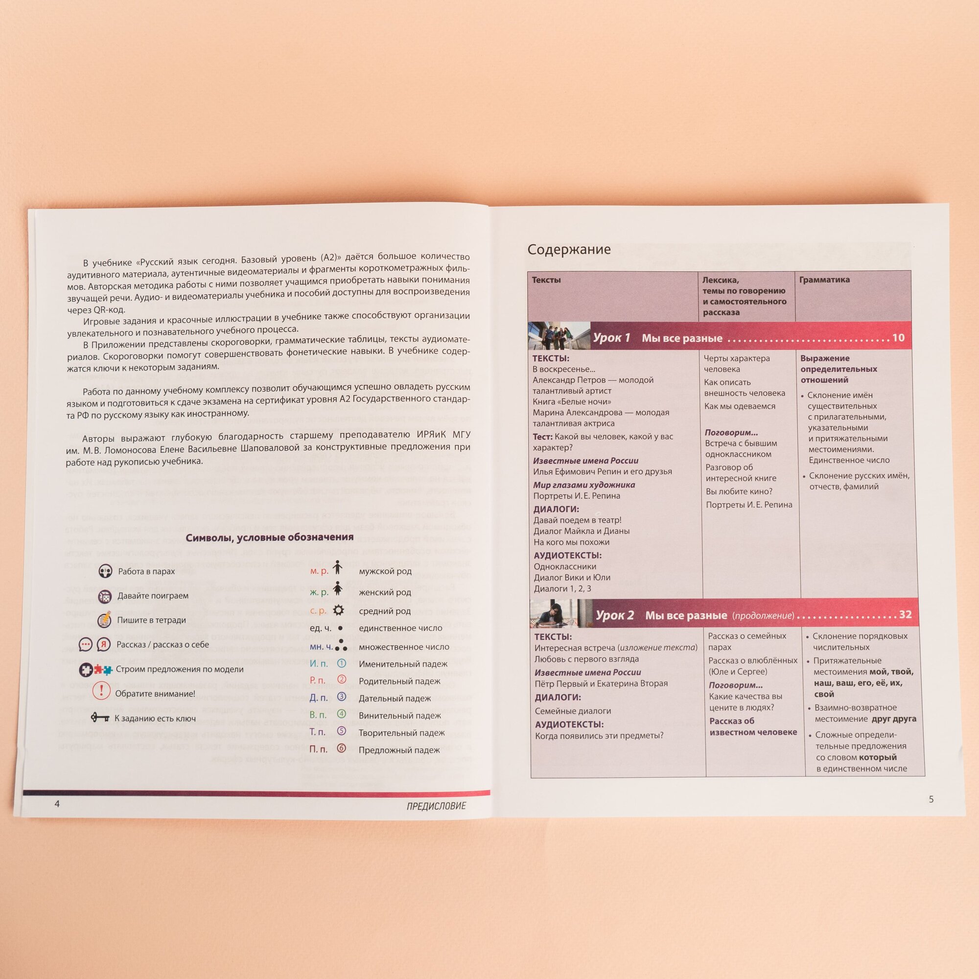 Учебник является главным компонентом учебного комплекса по русскому языку как иностранному Русский язык сегодня. Базовый уровень (А2) и предназначен для взрослых учащихся, продолжающих изучать русский язык. Это коммуникативно ориентированный курс, дающий возможность за короткий срок улучшить владение русским языком, параллельно повторяя и закрепляя пройденные на элементарном уровне темы. Материалы учебника способствуют развитию как диалогической, так и монологической речи, помогают более свободно выражать свои мысли в письменной форме, развивают навыки аудирования, а также изучающего, ознакомительного и поискового чтения.