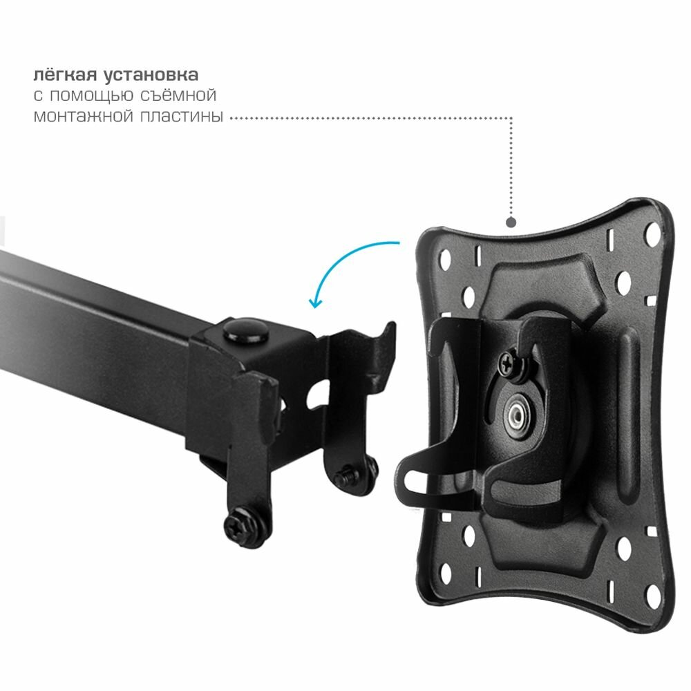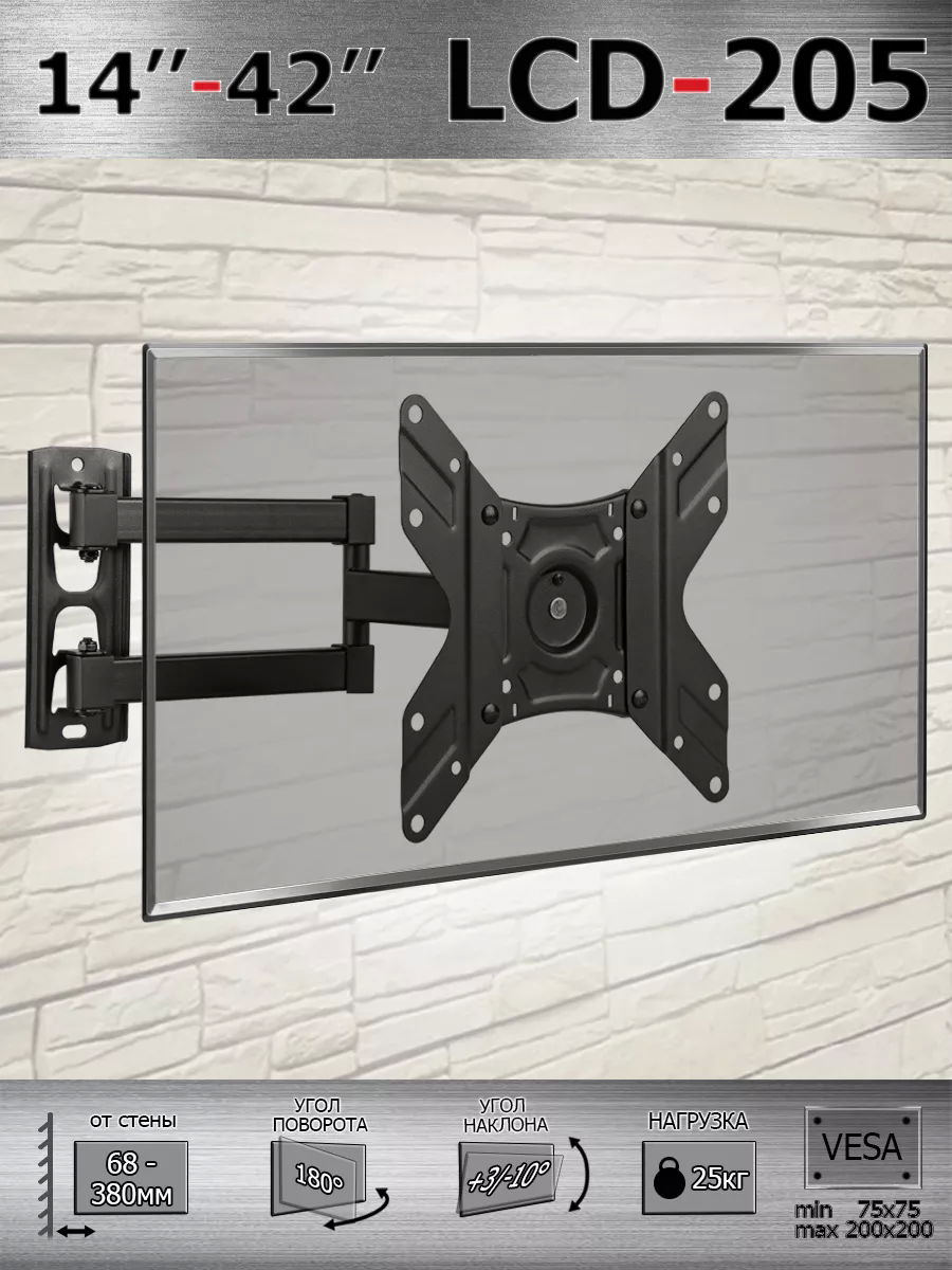 надежно удержит экран размером 14"-42" дюйма и весом 25 кг. Простая конструкция идеально подойдет для самостоятельного монтажа. Наклонно-поворотная регулировка позволит наклонять вверх и вниз на +3/-10°, поворачивать влево и вправо на 180°, и выдвигать на 68-380 мм.