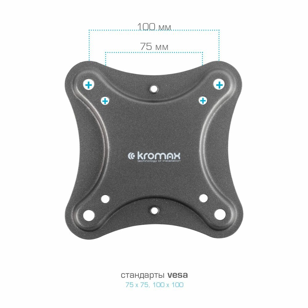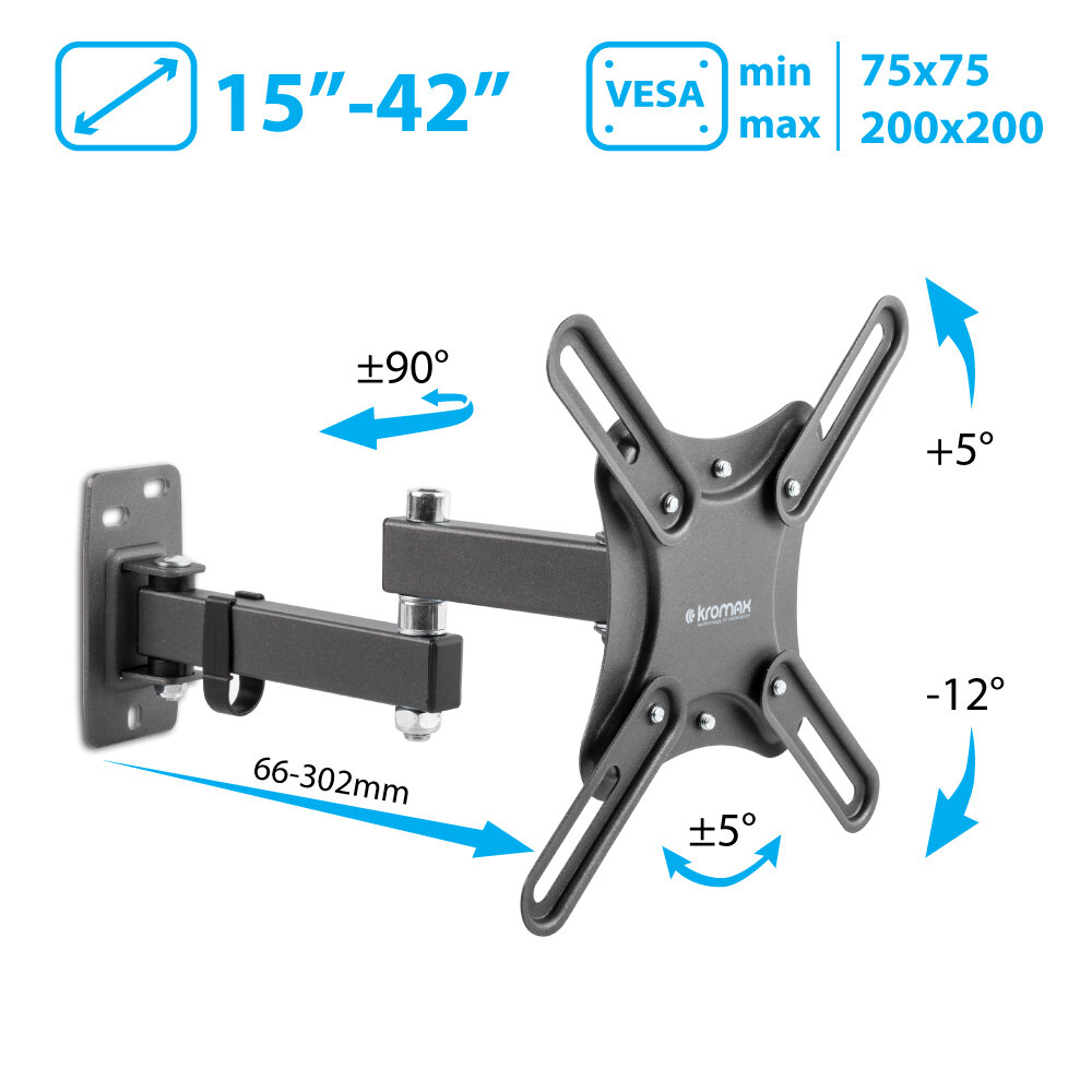 KROMAX BLACK надёжно удержит экран размером 15"-42" дюйма и весом 25 кг. Простая конструкция KROMAX BLACK идеально подойдет для самостоятельного монтажа. Наклонно-поворотная регулировка позволит наклонять вверх и вниз на +5°-12°, поворачивать влево и вправо на ±90°, и выдвигать на 66-302 мм.Кронштейн подходит для большинства телевизоров популярных брендов.Крепёжные отверстия KROMAX BLACK изготовлены по стандарту VESA.В комплектацию KROMAX BLACK входят необходимые для монтажа материалы. Вся продукция обеспечивается гарантийными обязательствами. Пожизненная гарантия на все сварные и механические соединения позволит наслаждаться конструкцией долгий срок. Во время эксплуатации KROMAX BLACK демонстрирует поразительную износостойкость и безотказность.