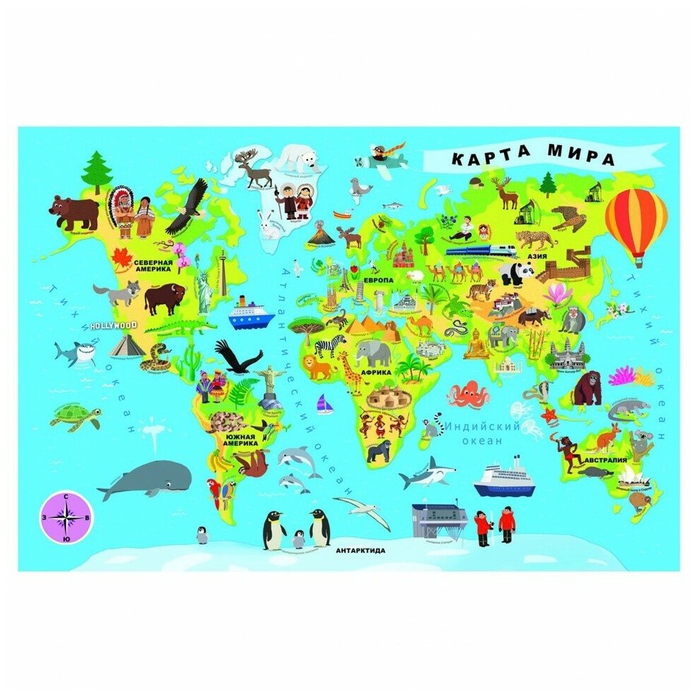 Изображение, которое должен собрать ребенок, представляет собой карту мира, на которой изображены не только материки и основные географические объекты, но и животные и достопримечательности, что позволит ребенку узнать много нового и интересного. Карта выполнена ярко и оригинально, что обязательно понравится как взрослым, так и детям.