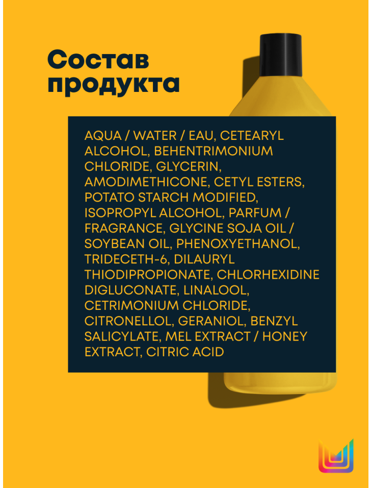 | Состав | aqua /water, cetearyl alcohol, behentrimonium chloride, glycerin, amodimethicone, cetyl esters, potato starch modified, isopropyl alcohol, parfum / fragrance, glycine soja oil / soybean oil, phenoxyethanol, trideceth-6, dilauryl thiodipropionate, chlorhexidine digluconate, linalool, cetrimonium chloride, citronellol, geraniol, benzyl salicylate, mel extract / honey extract, citric acid (f.i.l. C255716/1) |