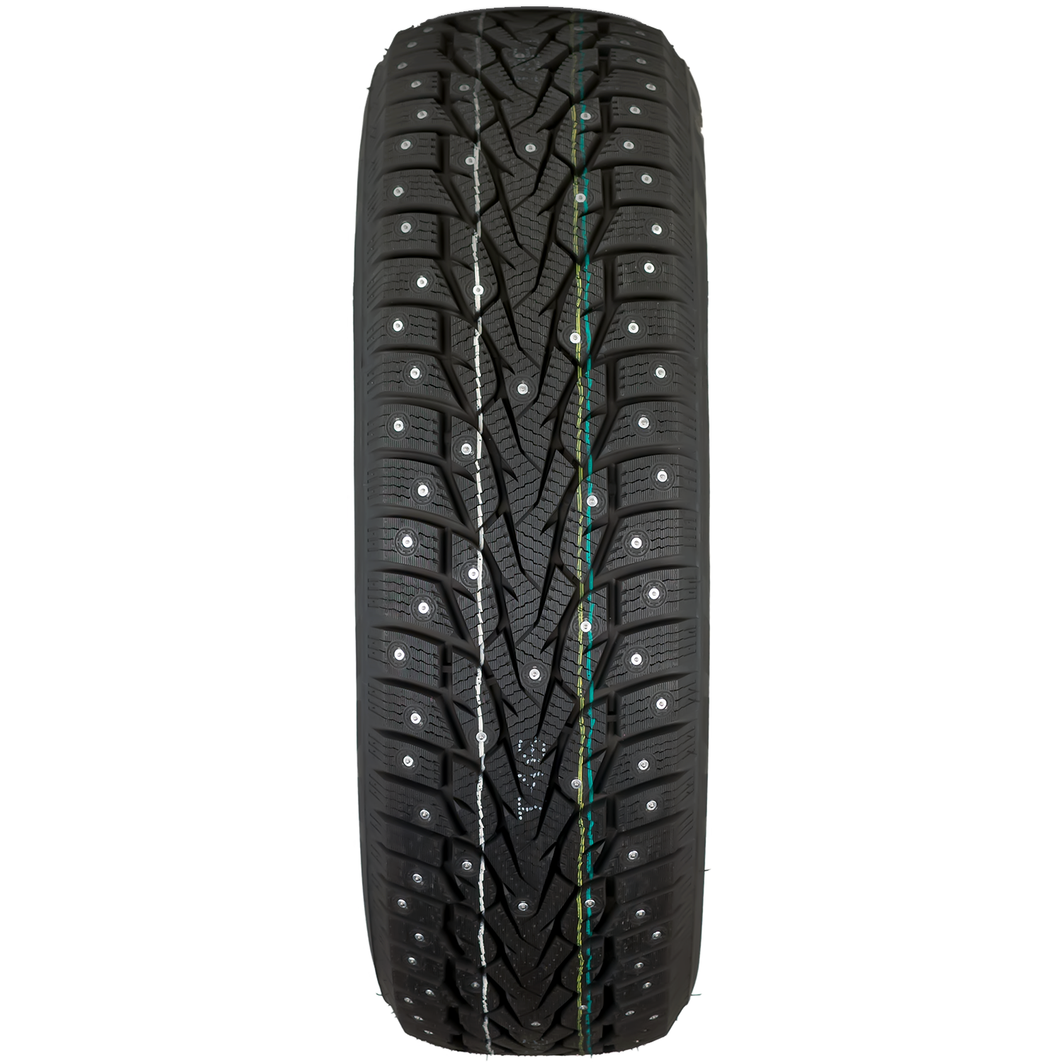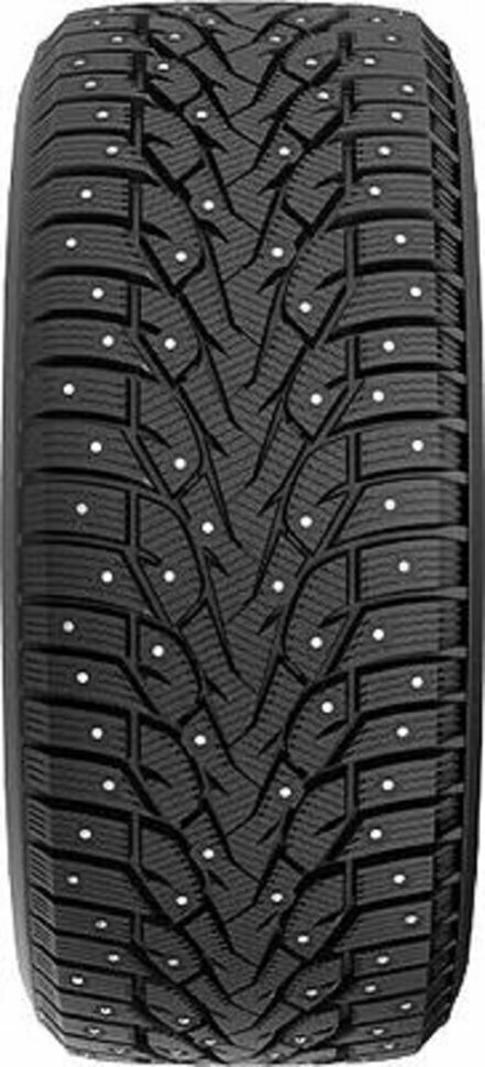 Рисунок протектора представлен широкой беговой частью с квадратными плечевыми зонами, что существенно увеличивает площадь пятна контакта. Оптимизированное расположение шипов усиливает равномерное сцепление с обледенелой и заснеженной трассой.