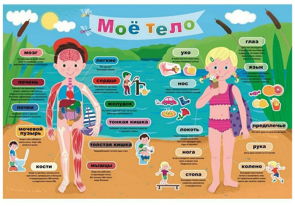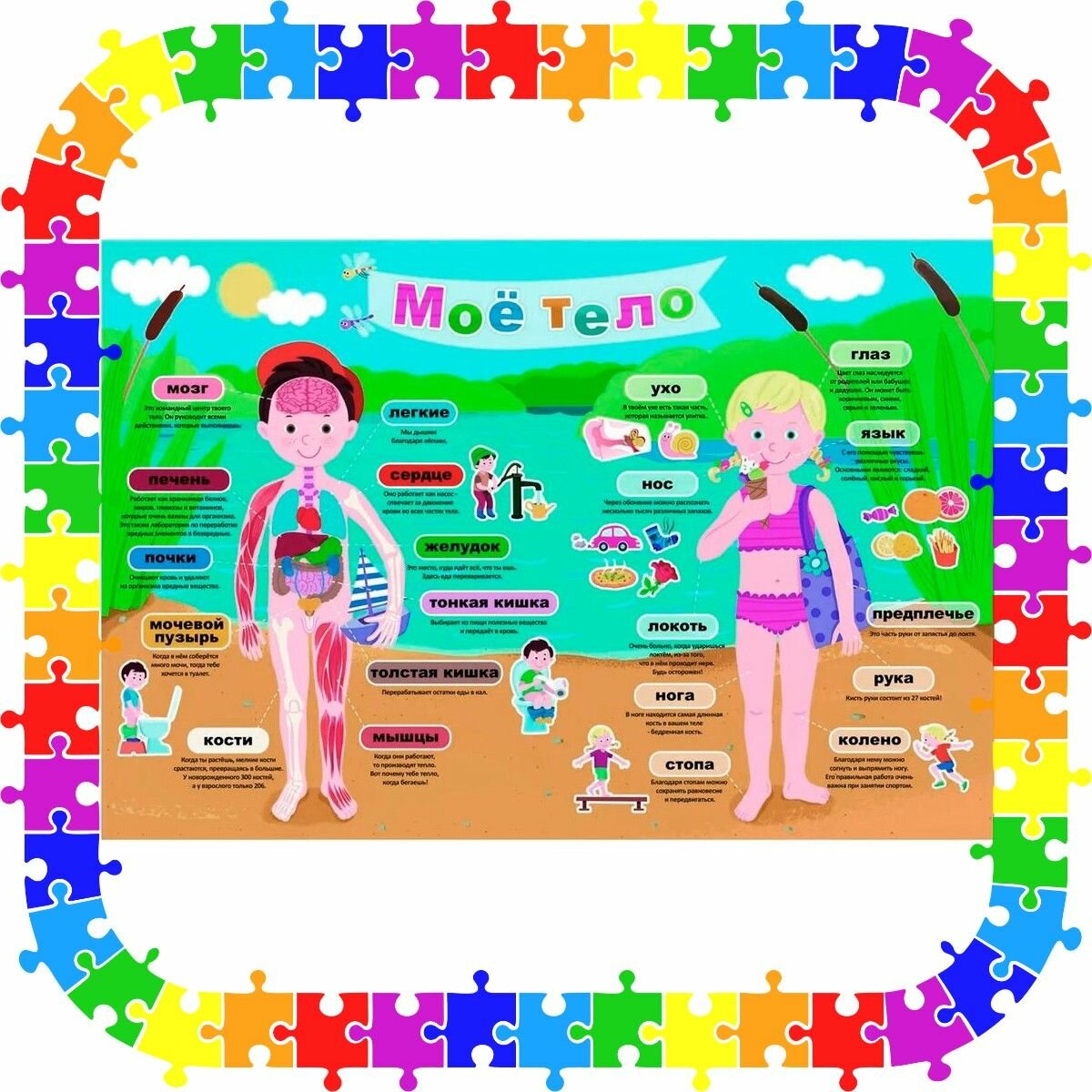 Пазл состоит из 40 деталей. Собрав все элементы, ребенок сможет узнать, где находится мозг, желудок, стопа, колено и многое другое, из чего состоит человеческий организм. На собранной картинке изображены мальчик и девочка, к каждой части тела которых направлены стрелочки. Рядом со стрелкой, в рамке написано слово, обозначающее тот или иной орган, а под этим словом идет подробное объяснение его смысла. Пазлы продаются в закрытой упаковке из плотного картона, на которой изображено ее содержимое.
