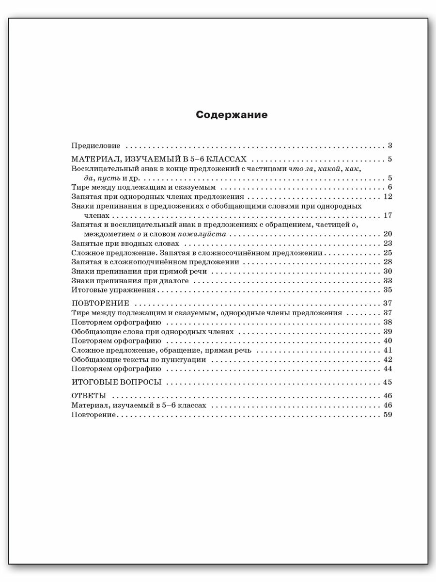 Пособие содержит основные правила пунктуации, изучаемые в 5-6?х классах, и упражнения для отработки полученных навыков. Удобная структура книги позволит быстро находить необходимые темы. Предлагаемый материал поможет ученикам начать качественную подготовку к ОГЭ и ЕГЭ по русскому языку. В конце пособия приведены ответы ко всем заданиям. Пособие составлено в соответствии с требованиями ФГОС основного общего образования.