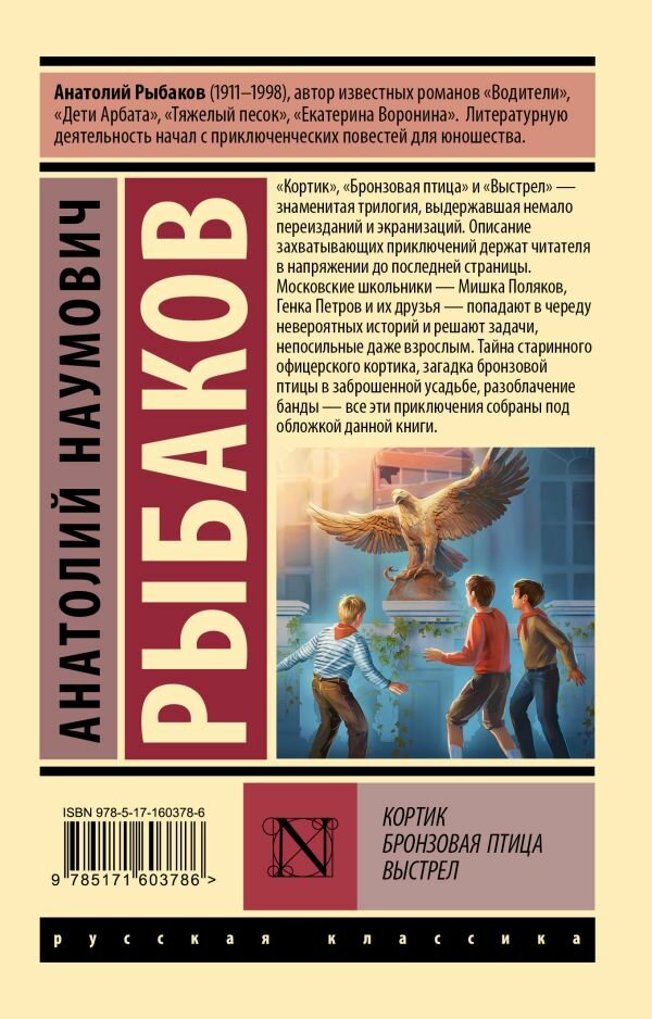 Анатолий Рыбаков (1911–1998), автор известных романов «Дети Арбата» и «Тяжелый песок». Литературную деятельность начал с приключенческих повестей для юношества. «Кортик», «Бронзовая птица» и «Выстрел» — знаменитая трилогия, неслучайно выдержавшая немало переизданий и экранизаций. Описание захватывающих приключений держат читателя в напряжении до последней страницы. Московские школьники — Мишка Поляков, Генка Петров и их друзья — попадают в череду невероятных историй и решают задачи, непосильные даже взрослым. Тайна старинного офицерского кортика, загадка бронзовой птицы в заброшенной усадьбе, разоблачение банды — все эти приключения собраны под обложкой данной книги.