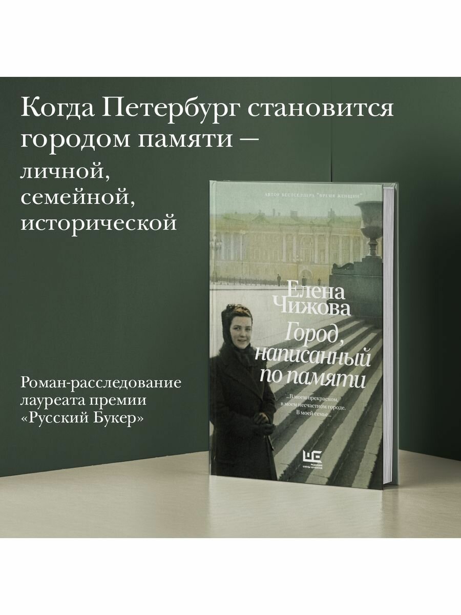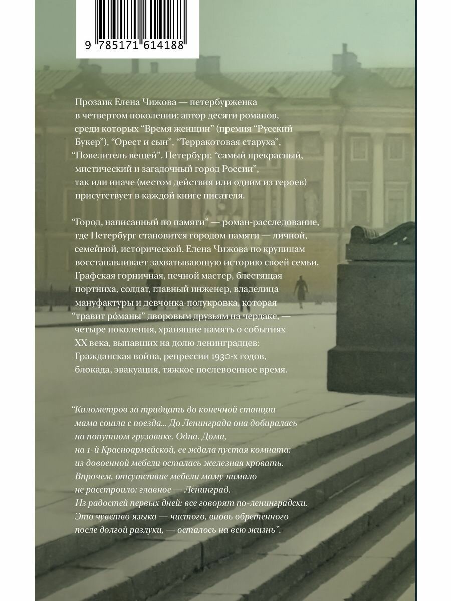 Прозаик Елена Чижова — петербурженка в четвертом поколении; автор десяти романов, среди которых “Время женщин” (премия “Русский Букер”), "Повелитель вещей", “Орест и сын”, “Терракотовая старуха”. Петербург, “самый прекрасный, таинственный, мистический город России”, так или иначе (местом действия или одним из героев) присутствует в каждой книге писателя. “Город, написанный по памяти” — роман-расследова- ние, где Петербург становится городом памяти — личной, семейной, исторической. Елена Чижова по крупицам вос- станавливает захватывающую историю своей семьи. Граф- ская горничная, печной мастер, блестящая портниха, сол- дат, главный инженер, владелица мануфактуры и девчонка-полукровка, которая “травит рoманы” дворовым друзьям на чердаке, — четыре поколения, хранящие память о событиях ХХ века, выпавших на долю ленинградцев: Гражданская война, репрессии 1930-х годов, блокада, эвакуация, тяжкое послевоенное время. «Километров за тридцать до конечно станции мама сошла с поезда… До Ленинграда она добиралась на попутном грузовике. Одна. Дома, на 1-й Красноармейской, ее ждала пустая комната: из довоенной мебели осталась железная кровать. Впрочем, отсутствие мебели маму нимало не расстроило: главное – Ленинград. Из радостей первый дней: все говорят по-ленинградски. Это чувство языка – чистого, вновь обретенного после долгой разлуки, - осталось на всю жизнь».