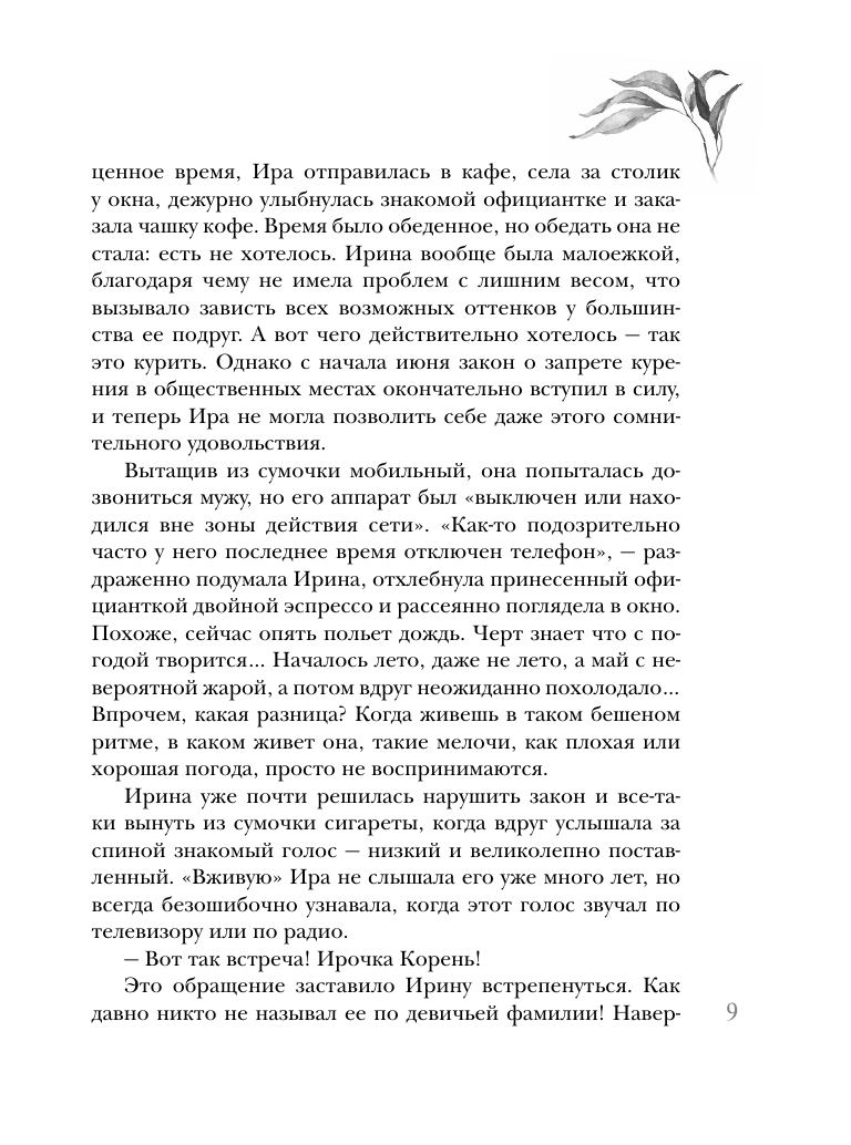 Успех и всенародная популярность, к которой всю жизнь стремилась Ирина Невельская, не приносят ей счастья. Да, она осуществила свою мечту – покорила Москву, стала знаменитой артисткой… Но почему же сейчас, когда она всего добилась, тоска и разочарование разрывают ей сердце? Почему не покидает мысль, что упущено что-то важное? Единственный ребенок – Алика – бросила институт, шляется по ночным клубам. Мужья… первый ушел сам, второго выгнала. Сплошные неудачи в семейной жизни! Как бы хотелось Ирине все наладить и исправить ошибки, которые совершила! Она готова даже пожертвовать любимой профессией ради этого. Однако спасение приходит неожиданно. И находит его Ирина в совершенно неожиданном месте – в своих истоках, в том месте, где родилась.