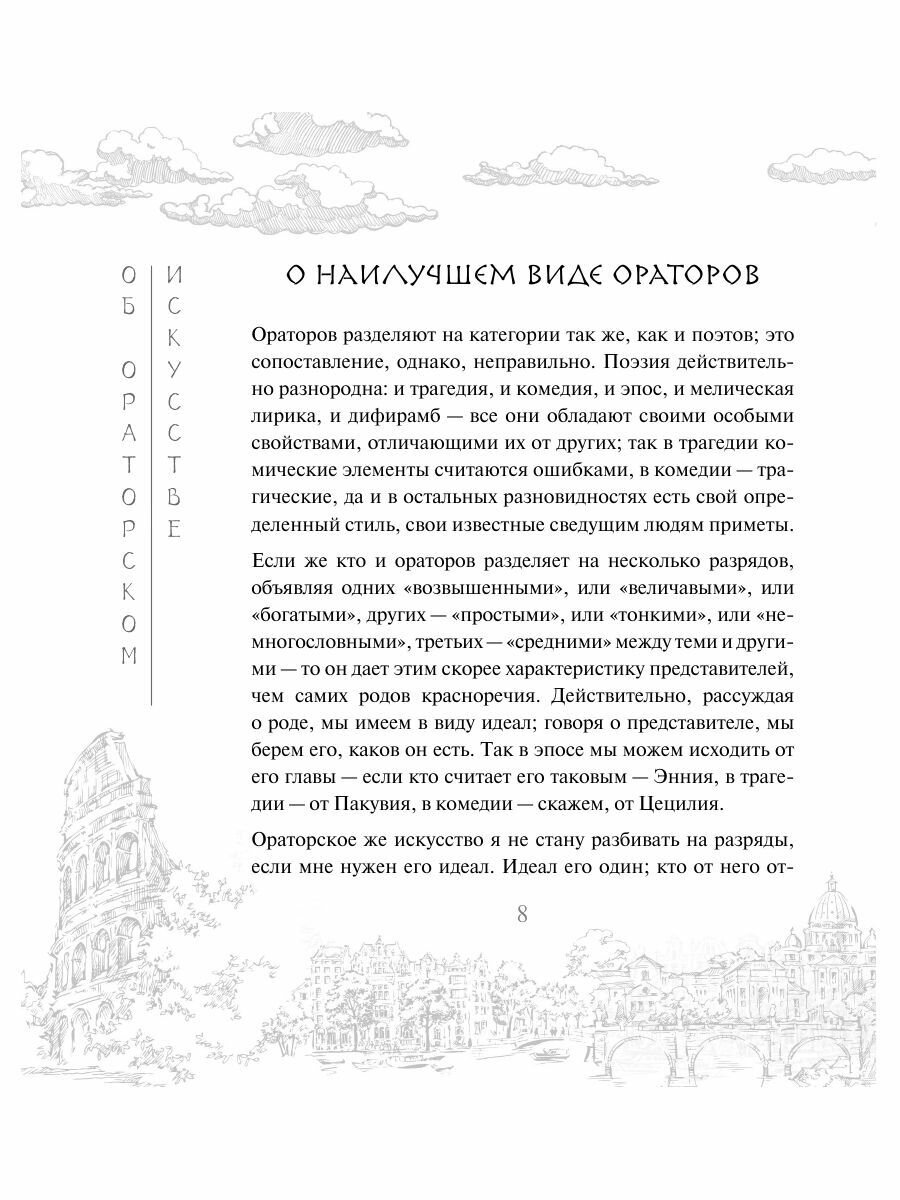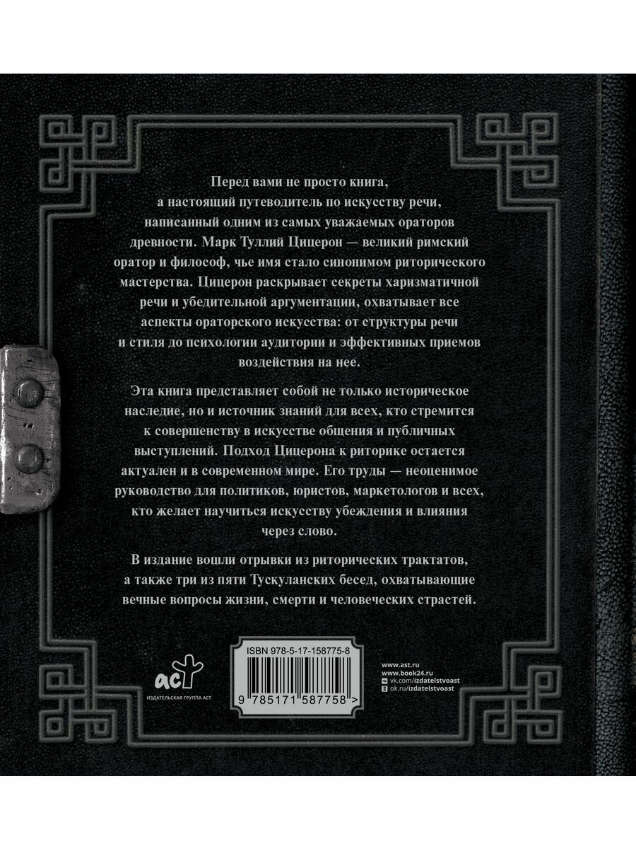 Перед вами не просто книга, а настоящий путеводитель по искусству речи, написанный одним из самых уважаемых ораторов древности. Марк Тулий Цицерон - великий римский оратор и философ, чье имя стало синонимом риторического мастерства. Цицерон, раскрывает секреты харизматичной речи и убедительной аргументации, охватывает все аспекты ораторского искусства: от структуры речи и стиля до психологии аудитории и эффективных приемов воздействия на нее.Эта книга представляет собой не только историческое наследие, но и источник знаний для всех, кто стремится к совершенству в искусстве общения и публичных выступлений. Подход Цицерона к риторике остается актуален и в современном мире. Его труды - неоценимое руководство для политиков, юристов, маркетологов и всех, кто желает научиться искусству убеждения и влияния через слово. В издание вошли отрывки из риторических трактатов, а также три из пяти Тускуланских бесед, охватывающие вечные вопросы жизни, смерти и человеческих страстей.