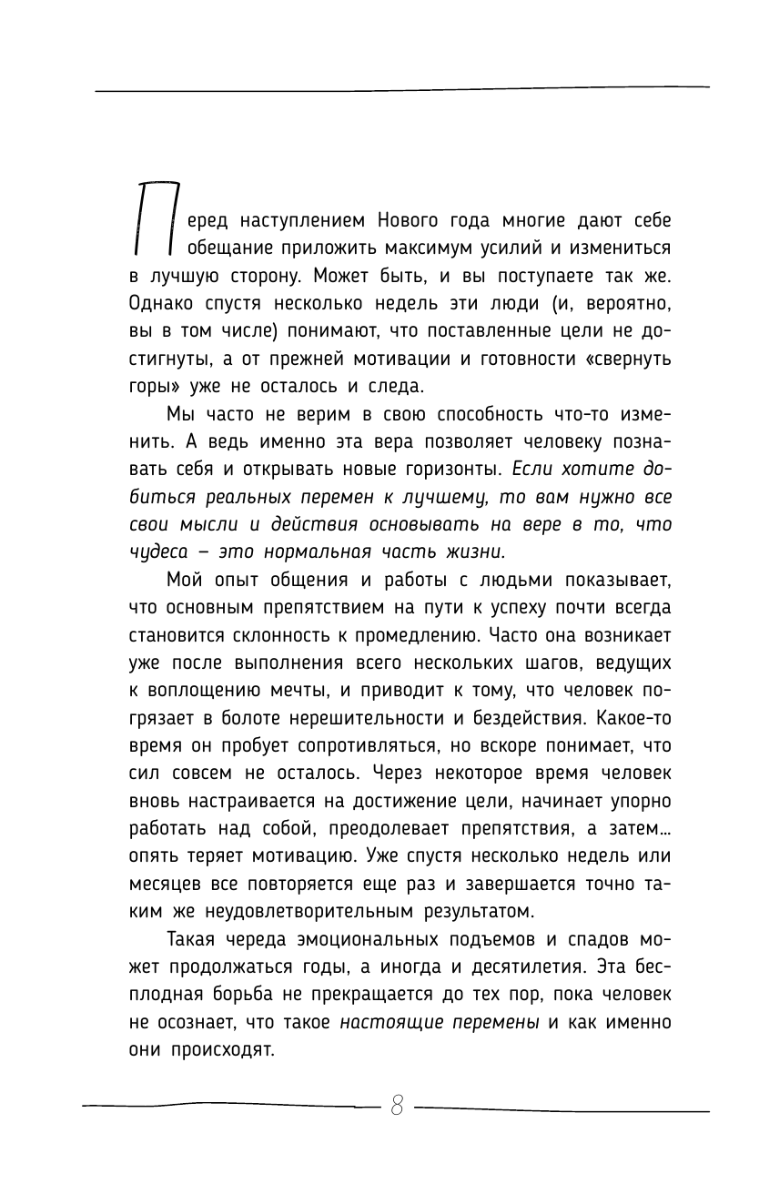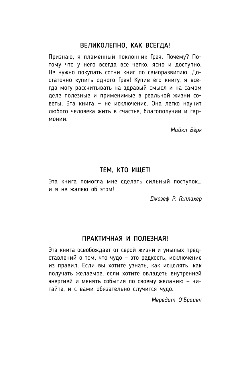 Вспомните истории о невероятном исцелении, головокружительном карьерном росте или превращении из нищего в миллионера! Все их герои сумели открыть в себе эту Силу! Девять руководящих принципов, разработанных Джоном Грэем, помогут и вам развить удивительную способность — творить чудеса.