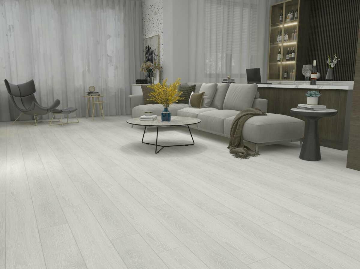 Ламинат надежен и удобен в эксплуатации, можно укладывать на больших площадях без разрывов. Сверху декоративный принт и два защитных слоя толщиной 0,3 мм.. Напольное покрытие SPC поглощает звуки: стук каблуков, цокот когтей собаки, шум от падения предметов.