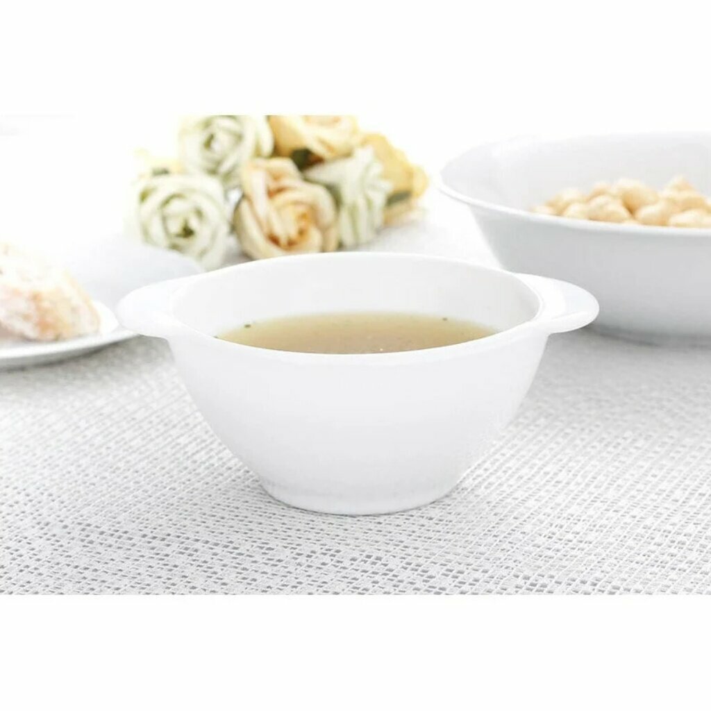 Стеклянная белая супница - универсальная посуда. Подходит для бульона, густых супчиков, десерта. Удобна для детского питания. У нее толстые стенки благодаря которым блюда остывают медленнее. Бульонницу можно использовать в СВЧ, мыть в посудомоечное машине.