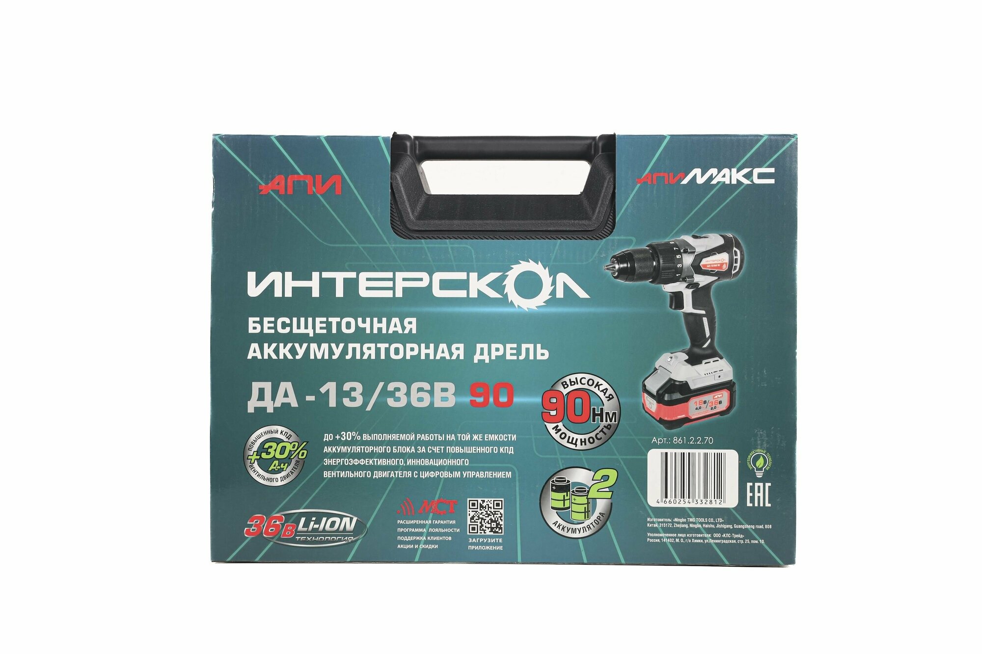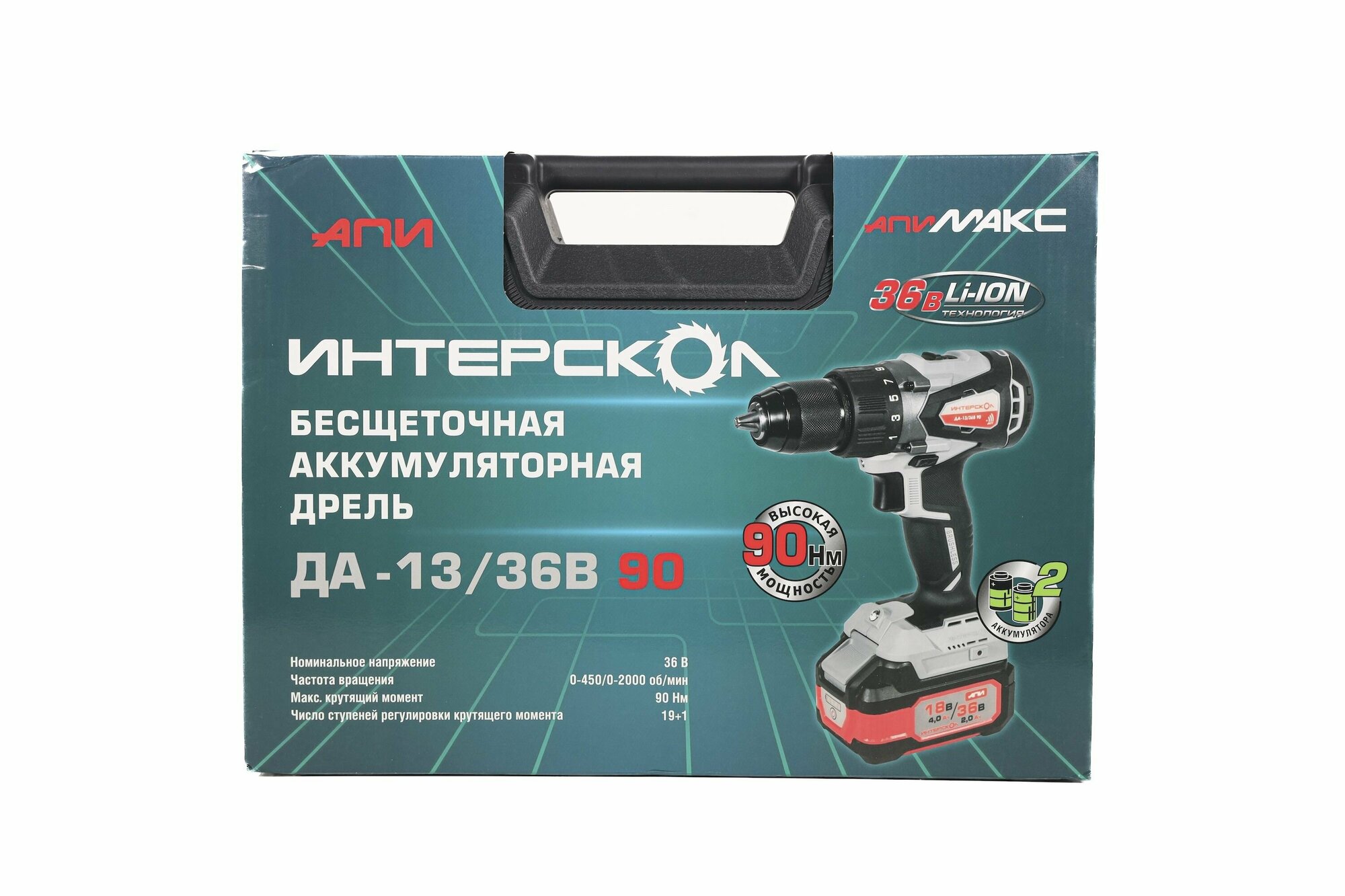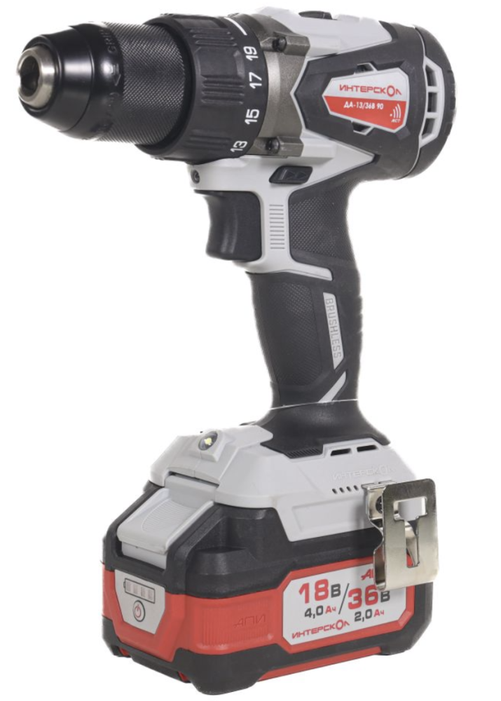 Бесщеточная аккумуляторная дрель-шуруповерт ИНТЕРСКОЛ ДА-13/36В 90 36 В 90 Нм 2000 об/мин с 2 АКБ 2 Ач и ЗУ в кейсе 861.2.2.70