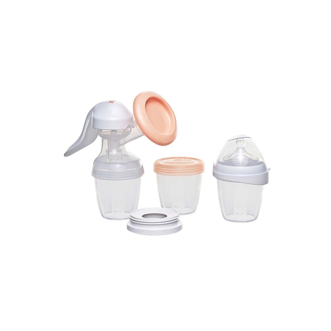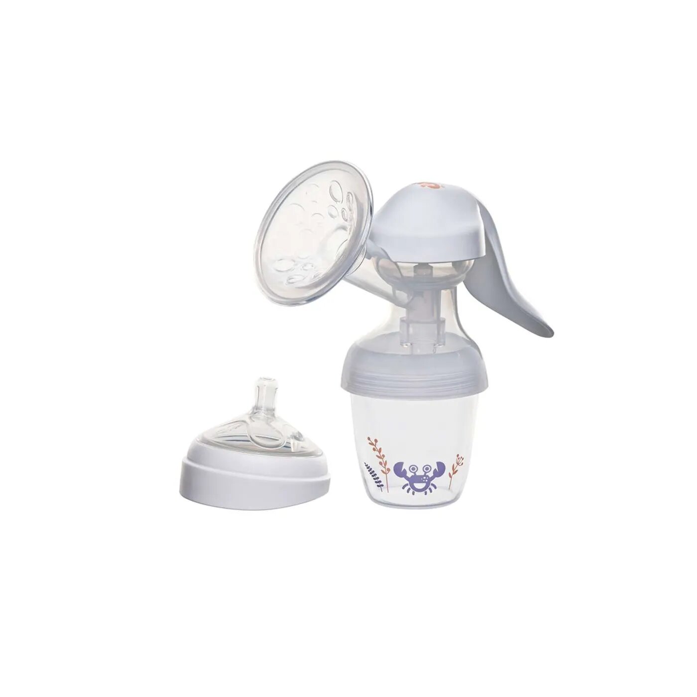 Работает без электричества. Совместим с элементами системы All In One: позволяет сцеживать молоко непосредственно в бутылочку и/или контейнер для грудного молока.