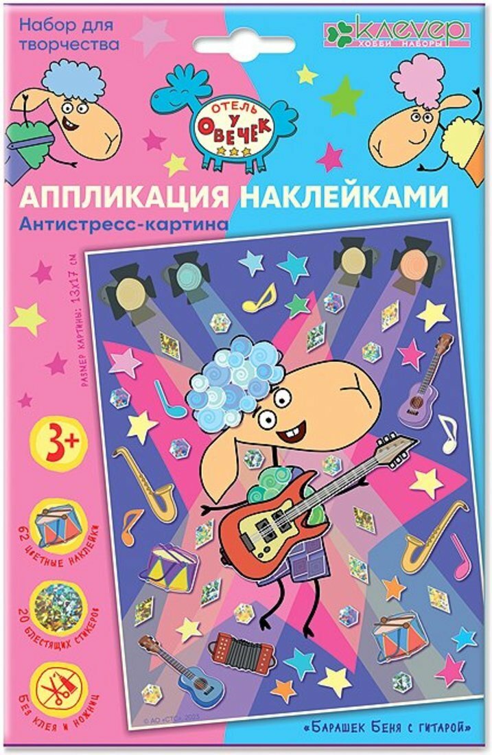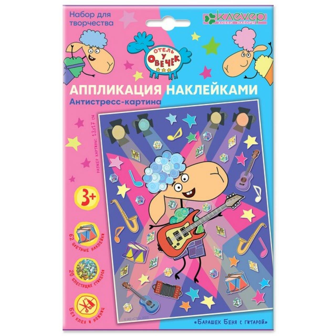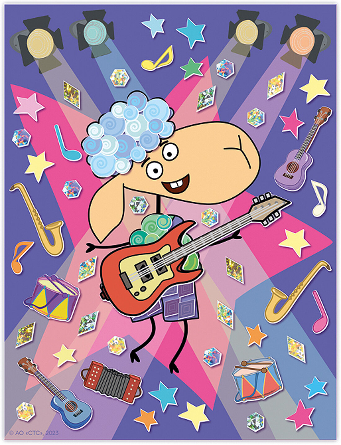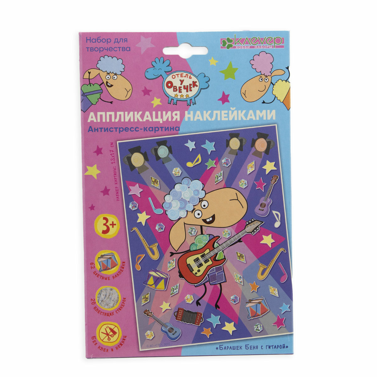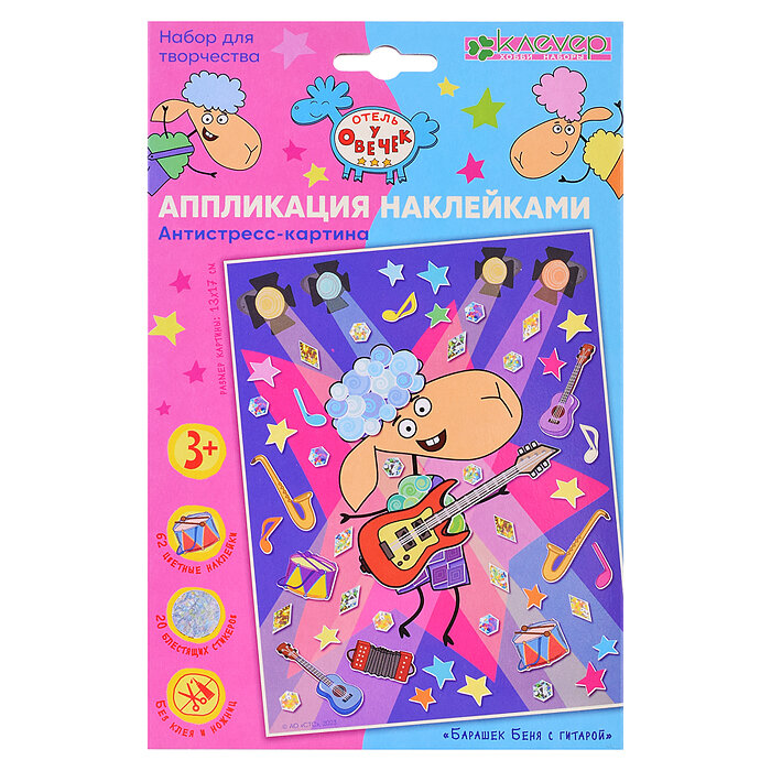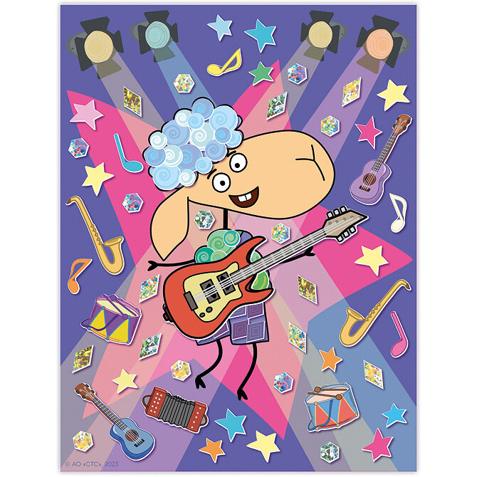 Волшебство техники "Антистресс-декорирование стикерами" (Аппликация наклейками) вовлечёт в творчество детей старше 3 лет. Заполнение картины с барашком Беней, играющим на гитаре в лучах софитов, цветными и голографическими наклейками по своему вкусу развивает воображение и мелкую моторику пальчиков ребёнка. Яркий, позитивный и красочный дизайн, простота работы и радость встречи с любимыми героями мультфильма "Отель у овечек" подарят ребенку отличное настроение!