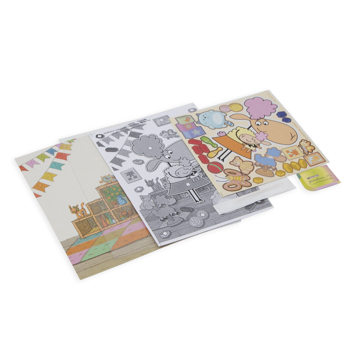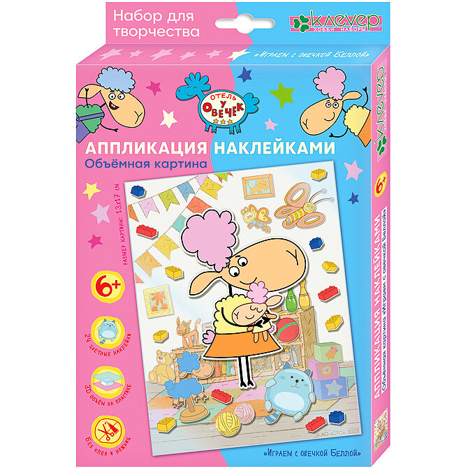 Волшебство техники "Антистресс-декорирование стикерами" (Аппликация наклейками) вовлекает в творчество детей старше 6 лет. Заполнение наклейками переднего плана картины по своему вкусу развивает воображение и мелкую моторику пальчиков ребёнка, готовя его руку к письму в школе. Объём картине придаёт наклеивание пластика с деталями на расстоянии от заднего плана картины, создавая эффект присутствия вместе с овечкой Беллой в игровой комнате. Красочный дизайн, простота работы и радость встречи с любимой героиней мультфильма "Отель у овечек" подарят ребенку отличное настроение!