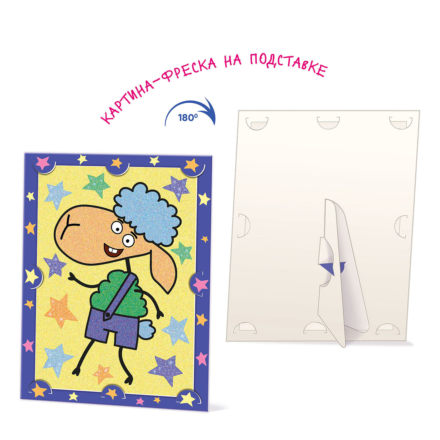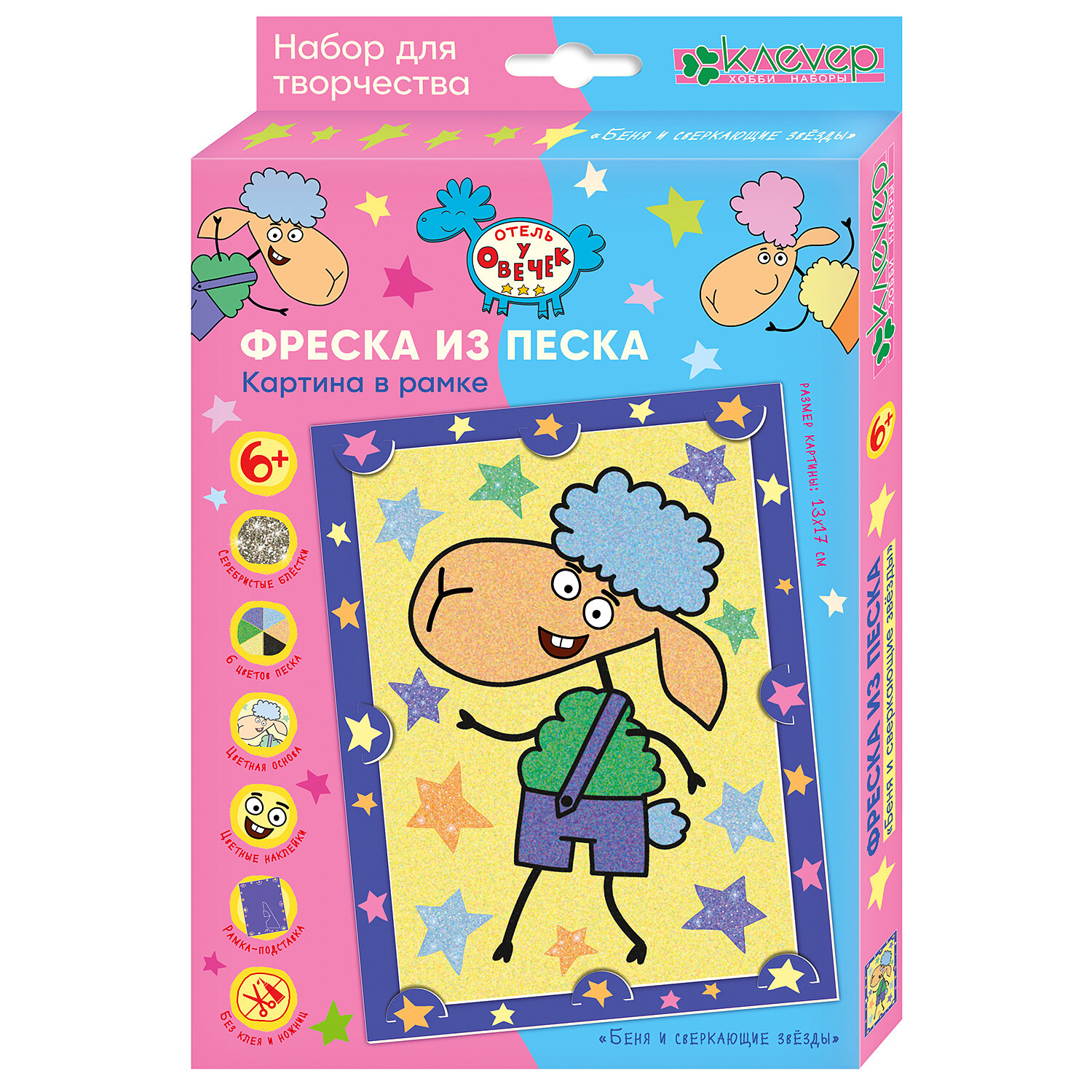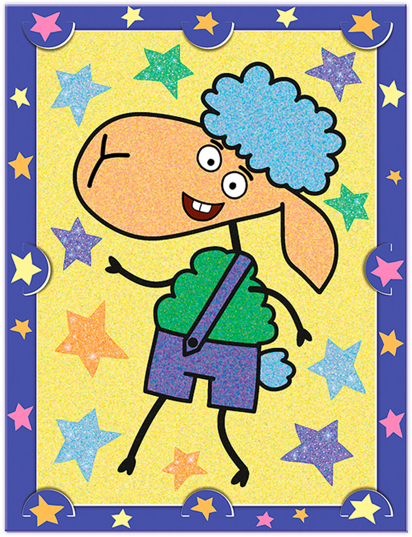 Рисование песком - популярный вид творчества у детей старше 6 лет. Создавая песочную картину с барашком Беней и звёздами из мультфильма "Отель у овечек", ребёнок почувствует себя настоящим художником. Добавление блёсток в песок для "раскрашивания" звёзд и размещение фрески в рамке-подставке придают песочной картине законченный вид. Творчество с песком помогает развивать воображение ребёнка, внимательность, аккуратность, мелкую моторику его пальчиков, через моторику - речь, память и координацию. Занятие с песком гармонизирует эмоции ребёнка и раскрывает широту творческого восприятия мира. Картина из песка выглядит очень декоративно!