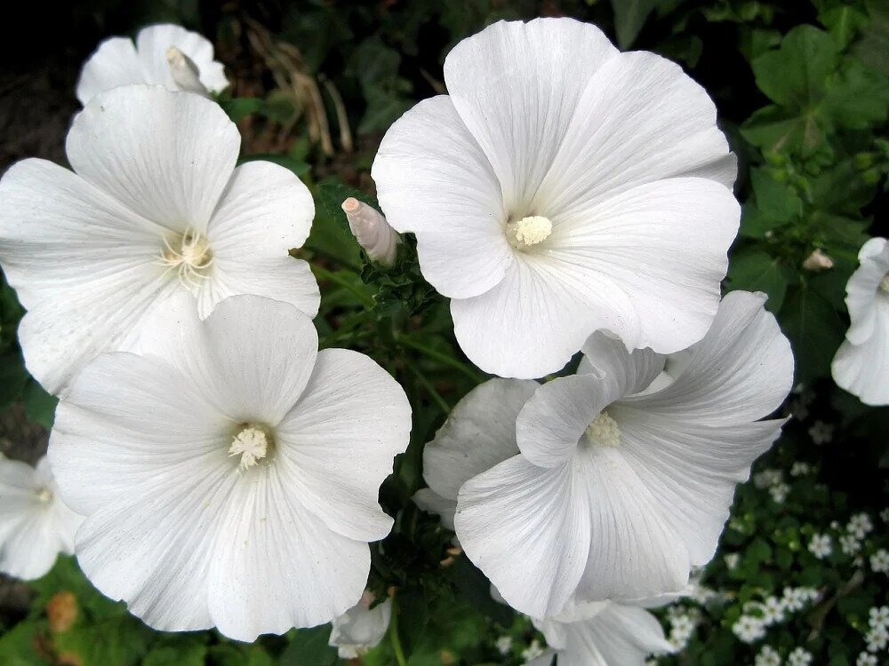 Крупные красивые яркие цветы. Мощные ветвистые растения высотой до 60 см. Диаметр соцветия 7-9 см, белой окраски. Обильное цветение с июля до конца сентября. Очень эффектны в групповых посадках, миксбордерах, цветы лаватеры хороши для срезки.