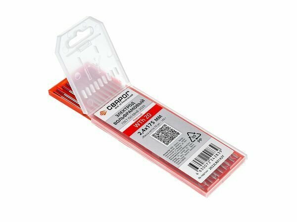 Электрод вольфрамовый WTh-20 (10 шт; 2.4x175 мм; ТМ упаковка) Сварог 99602 предназначен для сварки методом TIG в среде инертных газов. Применяется при сварке углеродистых, низколегированных и нержавеющих сталей, титана, меди и их сплавов на постоянном токе (DC). Содержит 2% оксида тория. Торий является радиоактивным материалом низкого уровня. Поэтому при регулярной сварке в закрытых помещениях следует строго соблюдать необходимые меры безопасности. Электрод характеризуется устойчивой дугой. Рабочий конец вольфрамового электрода должен быть чистым, иначе понижается надежность сварного шва, ухудшается его качество.