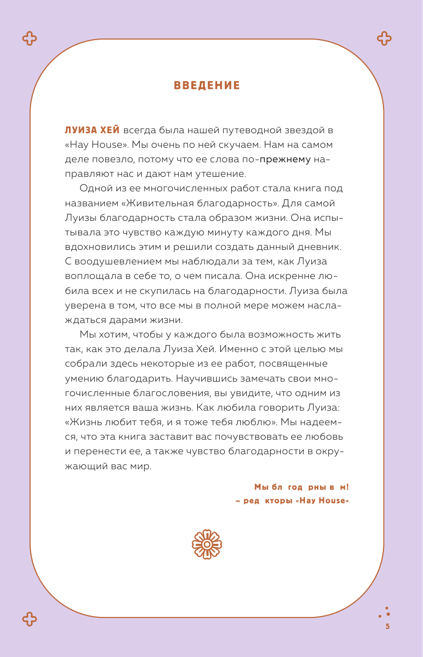 Вселенная всегда дает нам то, во что мы верим всем сердцем. Независимо от того, в чем наша проблема. Откройте для себя свои способы благодарить. Обретите свой дар благодарности с помощью этого живого блокнота, в основе которого — лучшие тексты и практики из сочинений Луизы Хей. Проверенные временем упражнения и аффирмации помогут процессу благодарности, чтобы он стал важнейшей частью жизни. Луиза Хей, автор мирового бестселлера «Исцели свою жизнь» и духовный учитель миллионов, более 30 лет помогала людям раскрыть весь свой потенциал для личностного роста и самоисцеления. Следуйте ее мудрым советам и практикам, и ваша жизнь изменится к лучшему.