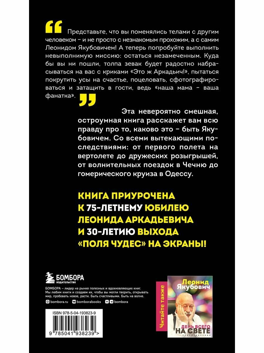 «Я родился в два часа с 30 на 1 июля. То есть, как истинный мужчина, я в доме появился ночью». Если Леонид Якубович для вас — это только бессменный ведущий передачи «Поле Чудес» на Первом канале или «тот самый усатый дядя из телика, раздающий автомобили», то эта книга станет для вас приятным открытием. Прочитав его во многом автобиографическую книгу, вы узнаете, что Леонид Аркадьевич — мастер попадать в нелепые ситуации и также мастер с блеском из них выпутываться. А еще что он прекрасный рассказчик и обладает потрясающим чувством юмора и прекрасно владеет словом. В это обновленное издание вошли новые рассказы Леонида Аркадьевича, которые расскажут вам всю правду про то, каково это — быть Якубовичем. Расскажет так легко и непосредственно, будто вы услышали все эти истории, попивая чай на одной кухне с ее автором. Первый полет на вертолете и назойливые журналисты, поездки в Чечню, дружеские розыгрыши с Геннадием Хазановым, все удачные и совсем не удачные попытки найти свой путь — чего только ни случалось в жизни этого всенародно обожаемого ведущего, талантливого актера и прекрасного человека.
