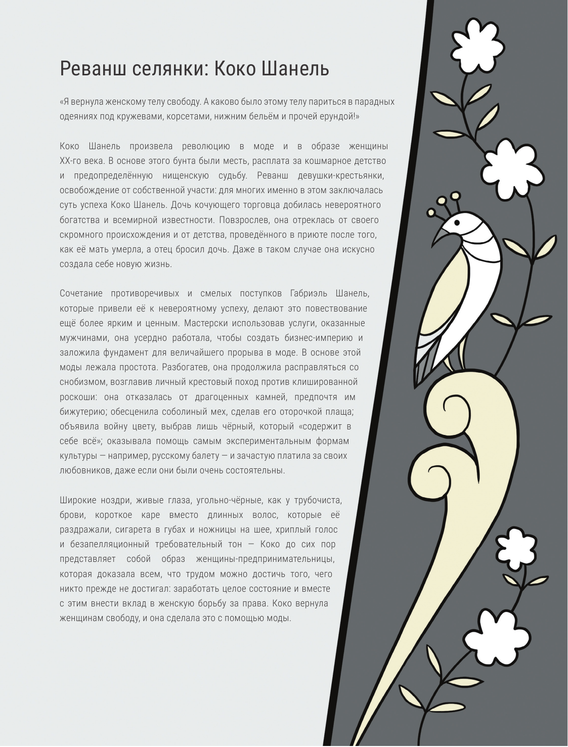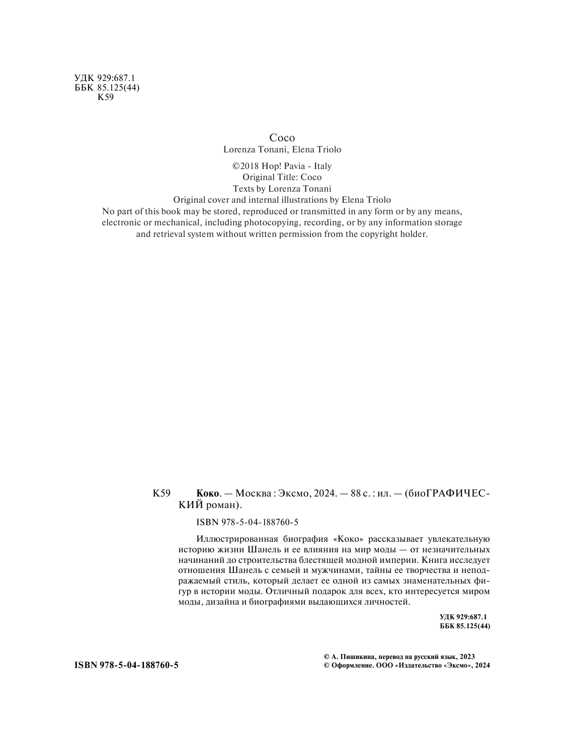 «Коко» — насыщенная иллюстрациями биография, которая повествует об этой известной женщине, ее роли в индустрии и создании модного дома Chanel. История Шанель начинается с ее рождения в скромной семье и через тернии приводит к созданию блестящей модной империи. Через историю и иллюстрации автор исследует отношения Шанель с семьей и партнерами, секреты ее уникального творчества и стиля. Узнайте, почему Шанель считается столь революционной фигурой не только для индустрии, но и для всего общества XX века. Книга станет прекрасным подарком тем, кому нравятся мода и дизайн! А также для всех поклонников Коко Шанель и биографий ярчайших и примечательных женщин.
