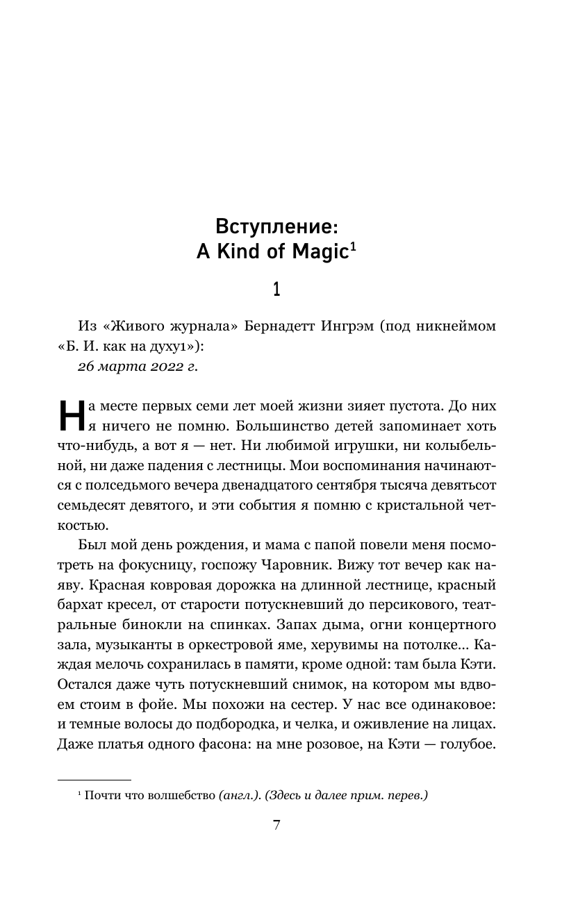 Новинка от Джоан Харрис, автора четырех циклов книг, мастера в создании уникальной атмосферы и захватывающего сюжета с сочетанием мистики, фэнтези и реализма. Главная героиня решает изменить существующие стереотипы в обществе и доказать, что открыть в себе новые способности и стремления можно в любом возрасте, а также, что никогда не поздно начать жить для себя. Берни Мун чувствует себя невидимкой. Она отдала свою жизнь другим людям — мужу, сыну, матери, друзьям (хотя у нее никого из них не осталось). В 16 лет она была полна надежд и сил. Теперь, когда ей исполнилось 50, она угасает. Но когда в ее районе убивают молодую женщину, это пробуждает детские воспоминания о таланте, который у нее когда-то был. Она обещала себе, что больше никогда им не воспользуется. Она знает, что это может уничтожить не только ее, но и всех вокруг. Берни Мун больше не остается незамеченной, но готовы ли окружающие принять ее желание измениться? Книга понравится поклонникам детективов, магического реализма, триллеров и качественной женской прозы.