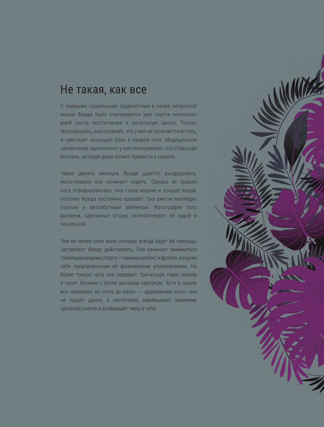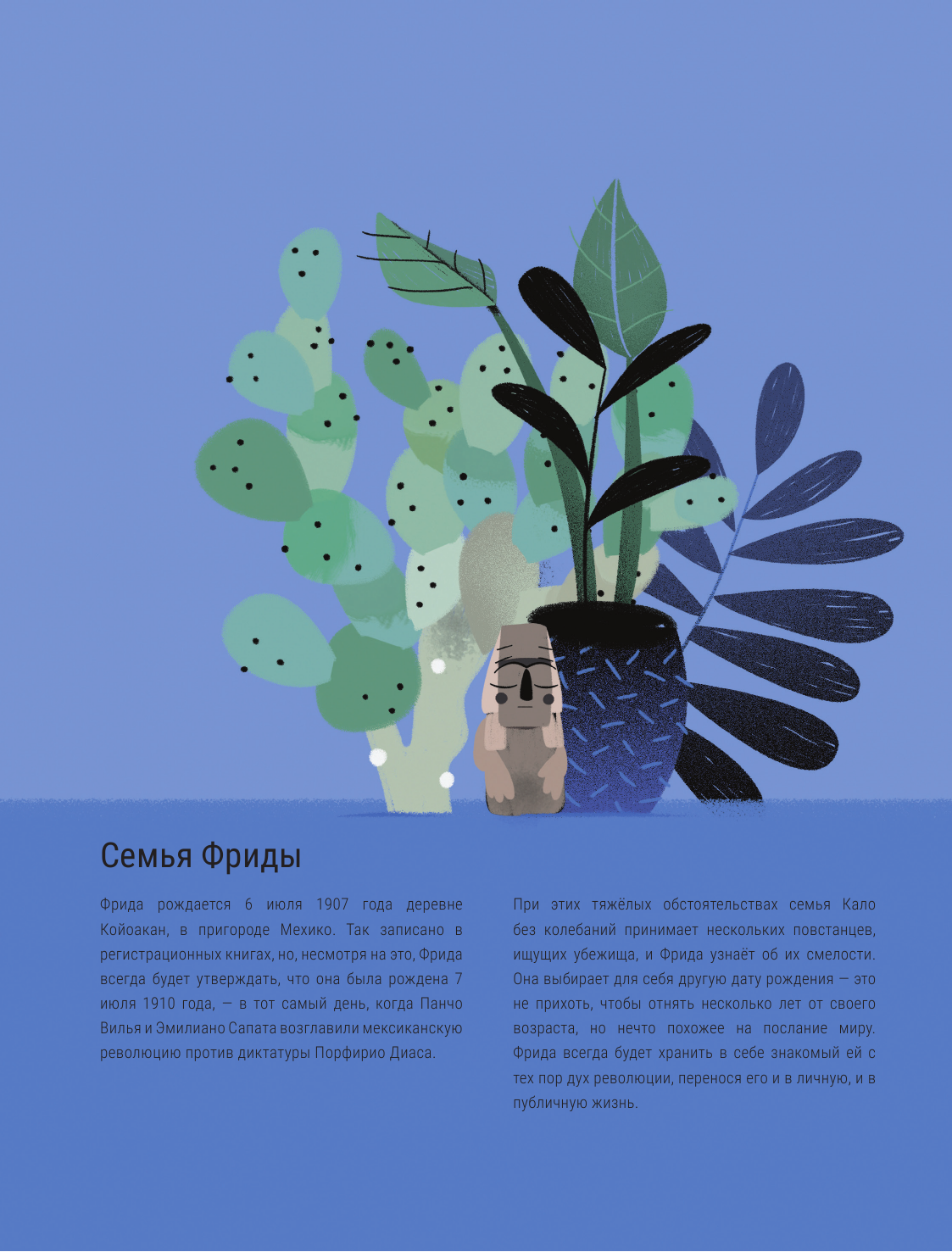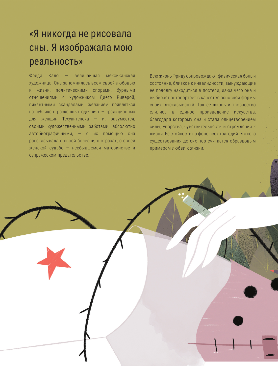 Иллюстрированная биография великой художницы, которая изменила мир! Познакомьтесь с жизненным путем и творчеством Фриды Кало, одной из самых важных личностей в истории XX века. История ее жизни полна борьбы за признание и преодоления невзгод. Фрида Кало оставила после себя не только произведения искусства, которые ценятся во всем мире, но и невероятную историю жизни, ознакомиться с которой определенно стоит. А яркие и стильные иллюстрации, которыми наполнена книга, сделают знакомство еще более наглядным.