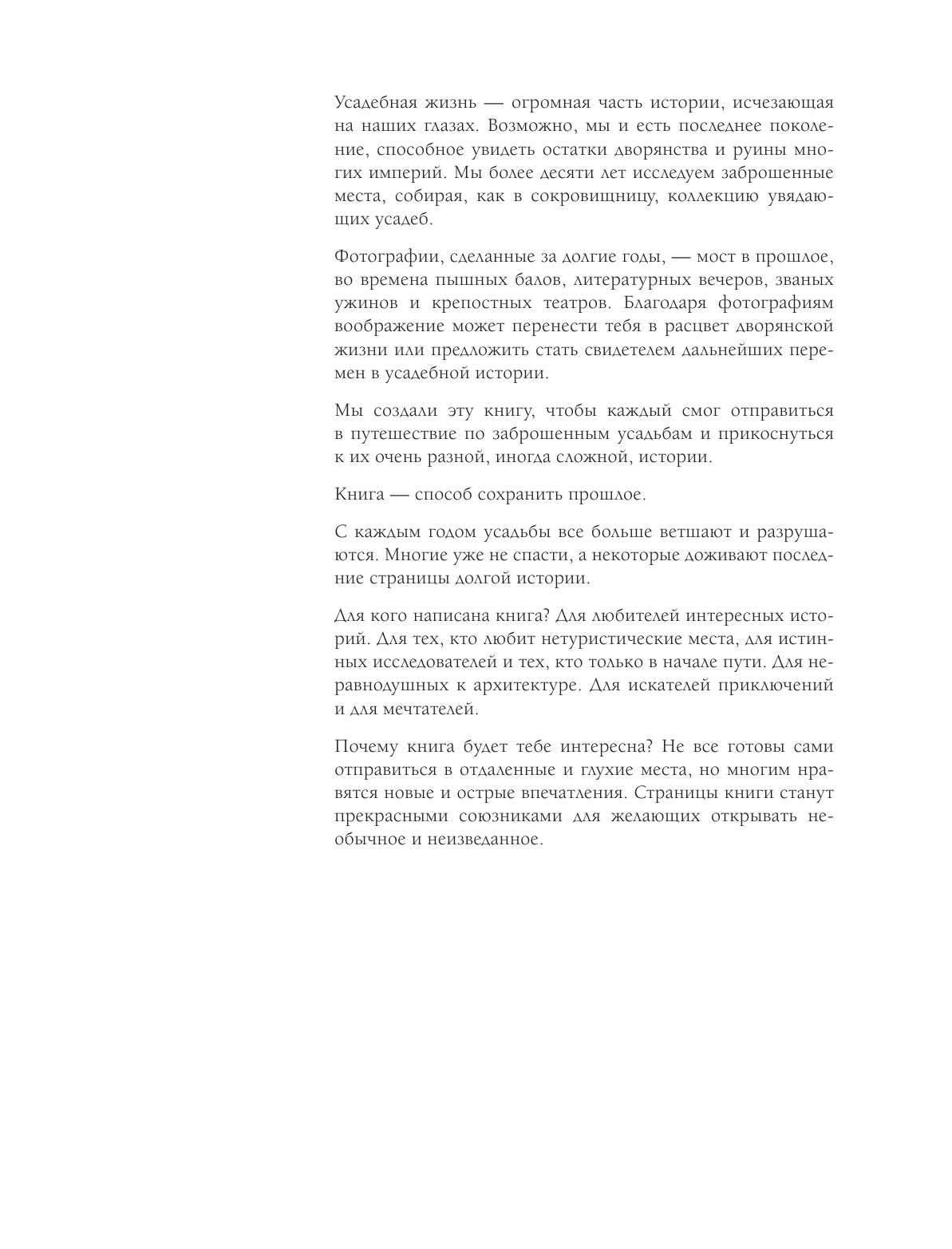 Завораживающий мир покинутых усадеб, оживающий в объективе путешественников Алексея Каменского и Виктории Попковой. "Усадьбы, затерянные во времени" — это не просто книга, это глубокое погружение в историю, атмосферу прошедших эпох и удивительное знакомство с невероятными людьми своего времени. На страницах книги вы узнаете секреты самых красивых и таинственных усадеб, их особенности архитектуры, истории жизней владельцев имений. Время отправиться в уникальное путешествие – без перелетов и паспортов!