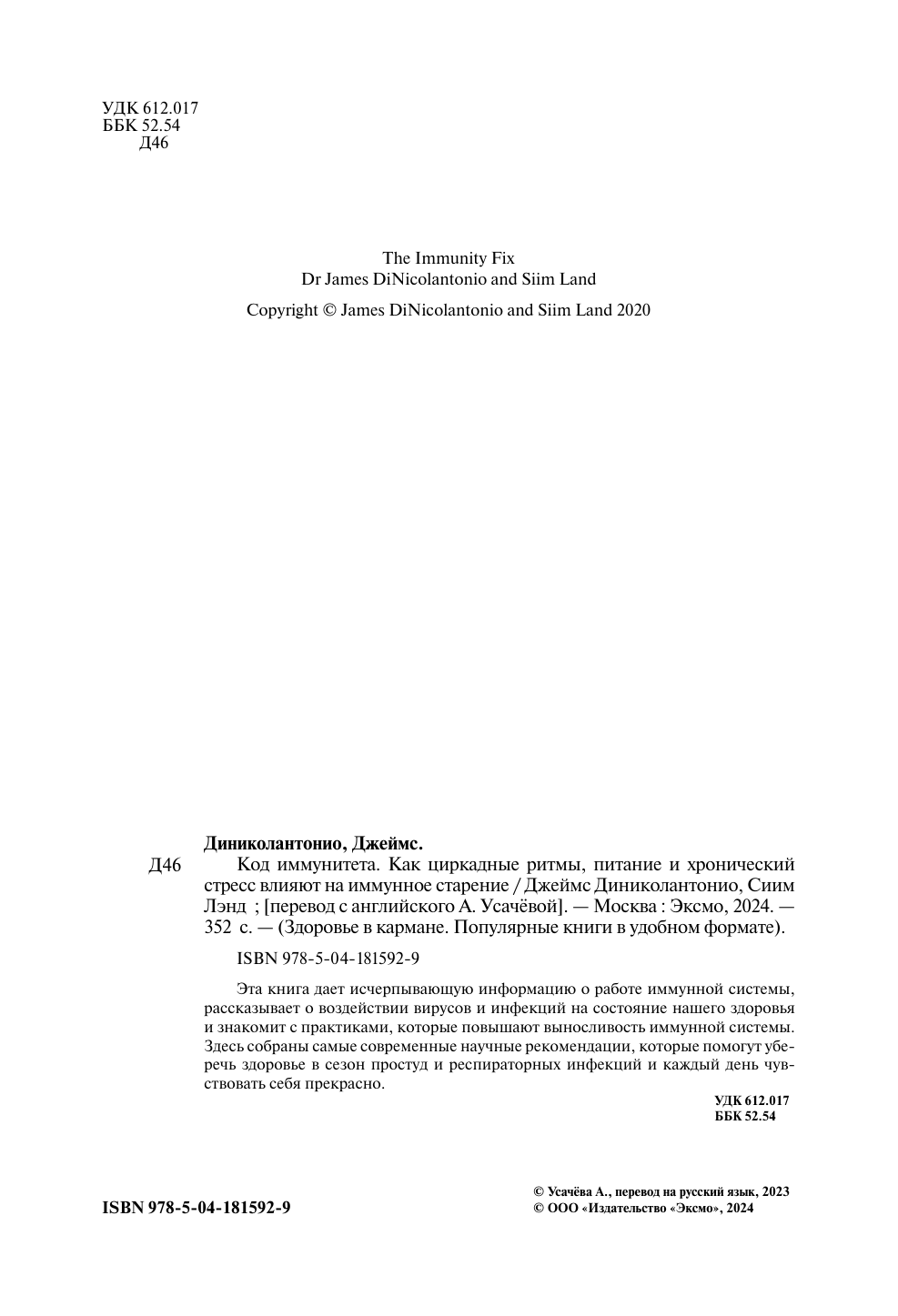 Код иммунитета. Как циркадные ритмы питание и хронический стресс влияют на иммунное старение (Диниколантонио Джеймс); ООО "Издательство "Эксмо", 2024