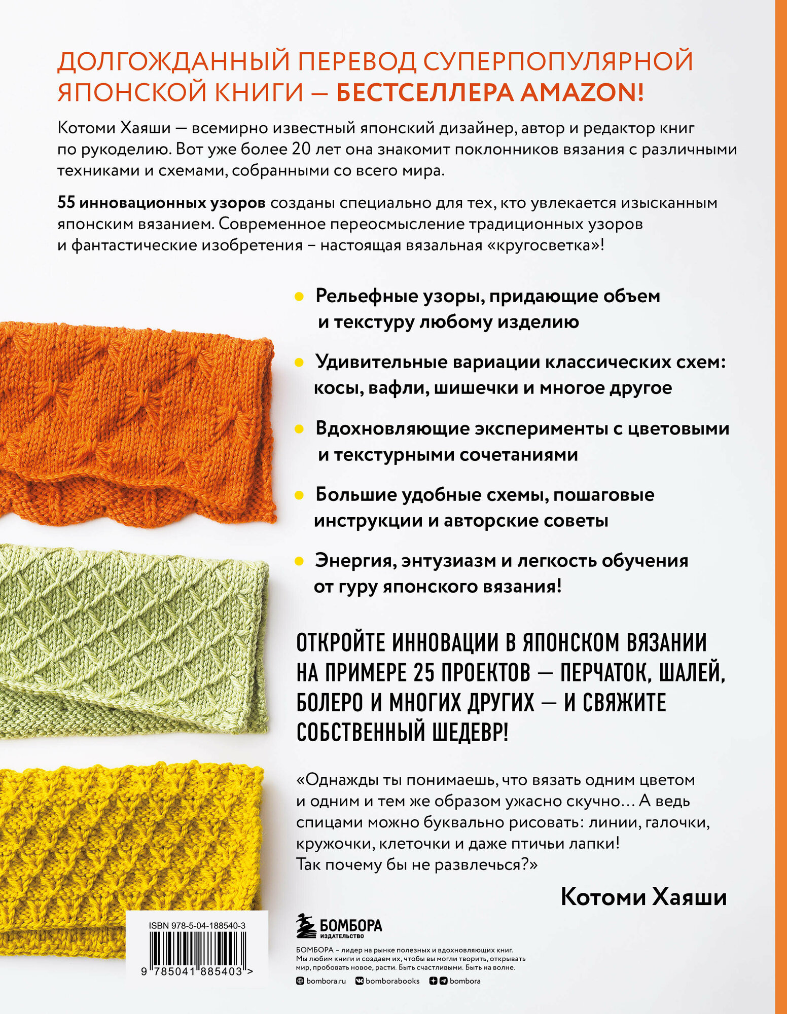 «Однажды ты понимаешь, что вязать одним цветом и одним и тем же образом ужасно скучно… А ведь спицами можно буквально рисовать: линии, галочки, кружочки, клеточки и даже птичьи лапки! Так почему бы не развлечься?» — Котоми Хаяши Добавьте к обычному узору всего одну петлю, и на вязаном полотне вырастет дикий цветок. Подцепите, вытяните — и получите шестиугольную решетку кагомэ. Закройте петли исландским способом и взорвите реальность карамельным «попкорном»! Это просто фантастика! • Восхитительные двусторонние выкройки — два предмета одежды в одном! • Узоры с рельефными мотивами, придающими объем и текстуру любому изделию. • Удивительные вариации классических схем: косы, вафли, шишечки и многое другое. • Вдохновляющие эксперименты по цветовым и текстурным сочетаниям. • Большие удобные схемы, пошаговые инструкции и авторские советы. • Энергия, энтузиазм и легкость обучения от гуру японского вязания! «Поразительно актуальное использование цвета! Фантастическая красота. Это так смело и свежо… Наконец-то у нас есть перевод книги от Котоми Хаяши!» — Гейл Рем, преподаватель по вязанию, американский переводчик звезды японского вязания Хитоми Шиды