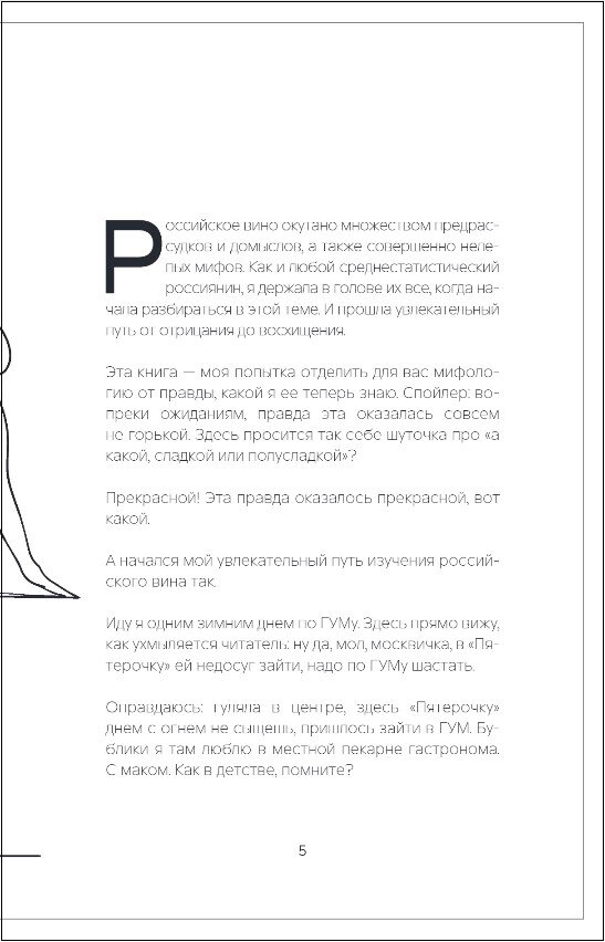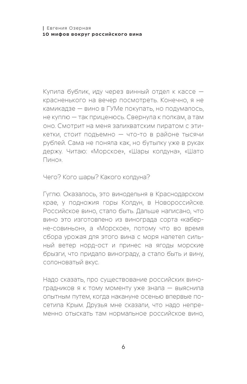 Осторожно! Эта книга побуждает читателя немедленно пойти в магазин за российским вином. Что еще за русское вино и существует ли оно в природе? Не то ли это, что из порошка? Виноградники же были уничтожены во времена «сухого закона»? Пейте сами свое «Российское шампанское». Автор книги Евгения Озерная, амбассадор российского виноделия, создатель и идейный вдохновитель винного проекта «Вино и радости» и винолюб со стажем, готова вместе с вами шаг за шагом развеивать мифы, которыми окутана прекрасная правда о современном российском виноделии. Вместе с российскими виноделами она обошла сотни гектаров виноградников, попробовала множество вин, побывала на небольших фермерских винодельнях и огромных винных заводах с одной-единственной целью — рассказать вам, какое оно — современное русское вино: кто, где и как его делает. И почему, несмотря на то что наши вина завоевывают международные награды и попадают в престижные винные рейтинги, сами россияне относятся к нему настороженно. Эта книга — результат долгих часов бесед с российскими виноделами, владельцами виноделен, винными экспертами и теми, кто стоял у истоков современного российского виноделия. В книге звучат их живые голоса, помогая читателю открывать для себя увлекательный мир русского вина.
