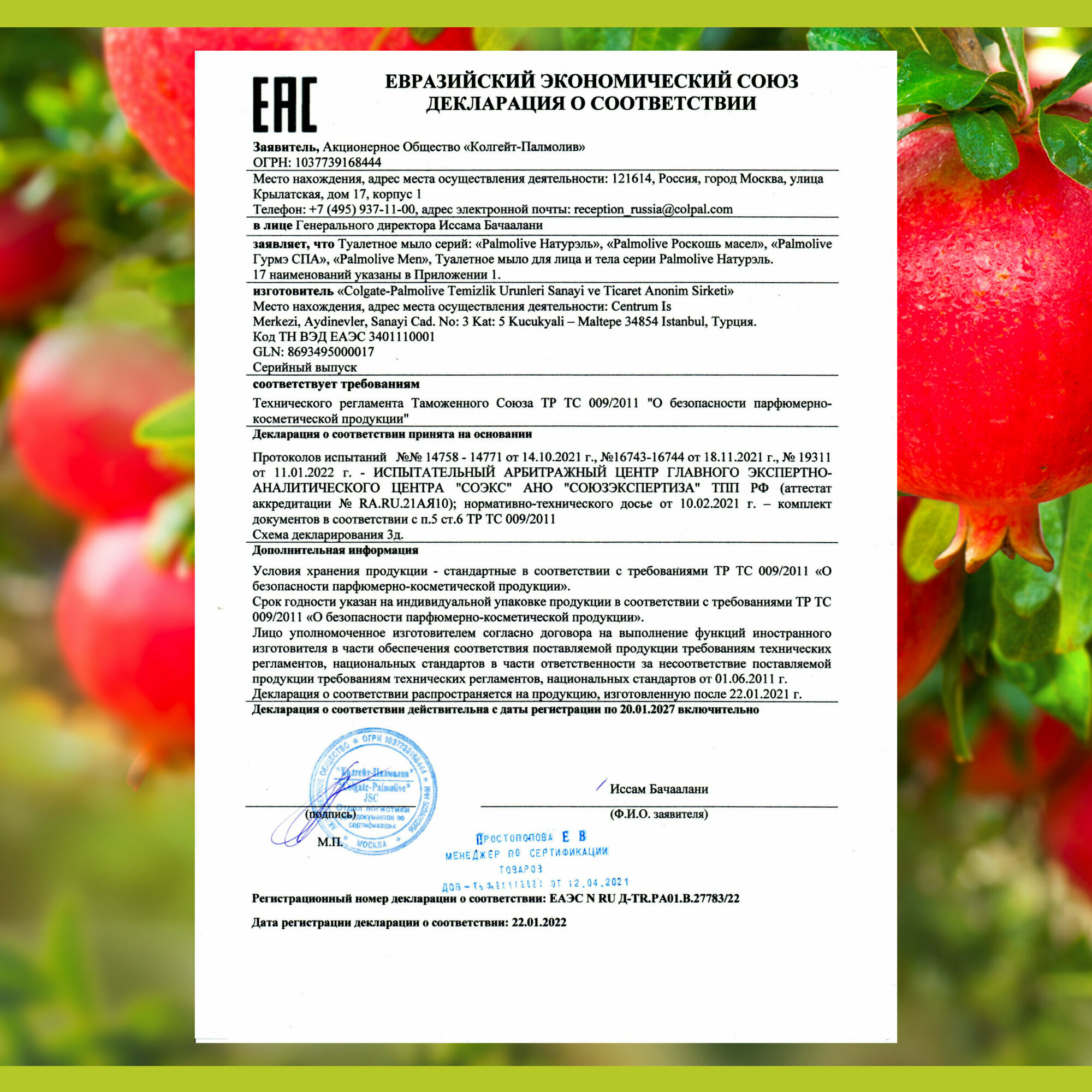| Особенности | Формула твердого мыла обогащена 100% натуральными ингредиентами; Подходит для лица и тела; Содержит 100% натуральный экстракт граната и 100% натуральные масла; Содержит увлажняющий компонент; Не содержит парабенов и силиконов; Перерабатываемая упаковка мыла весом 150 г. Твёрдое мыло Palmolive произведено в Турции и соответствует международным стандартам качества. |