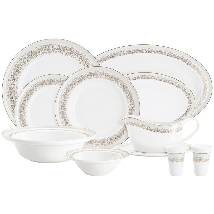| Состав набора | 6 обеденных тарелок 27 см, 6 суповых тарелок 21,5 см, 6 закусочных тарелок 20 см, 1 салатник 23 см, 1,8 л, 2 салатника 14 см, 0,6 л, блюдо 35,5 см, блюдо 25 см, соусник 0,5 л, блюдо под соусник 21 см, солонка, перечница |