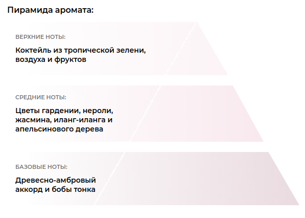 | Аромат | Тропическая зелень, фрукты, гардения, нероли, жасмин |