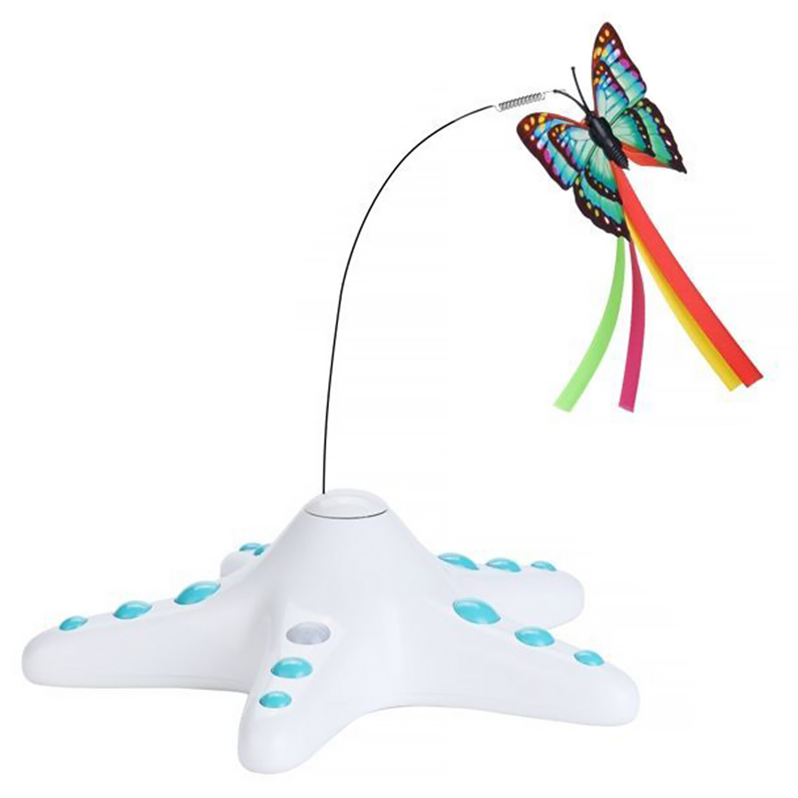 Сенсорная игрушка «Butterfly» с основанием в виде симпатичной морской звезды, крутит в разные стороны изящную бабочку на проволоке, создавая иллюзию полета настоящего насекомого для удовлетворения охотничьих инстинктов котика. У игрушки 2 режима: медленный и быстрый. В комплекте идут 2 яркие разноцветные бабочки, сделанные из тонкого прочного пластика, который легко гнется, но не рвется. Их можно менять по мере повреждения или перед каждой игрой, чтобы разнообразить досуг пушистика. Игрушка перестает работать через 30 секунд, если с ней не взаимодействовать и возобновляет работу, когда сенсор замечает движение в радиусе трех метров.