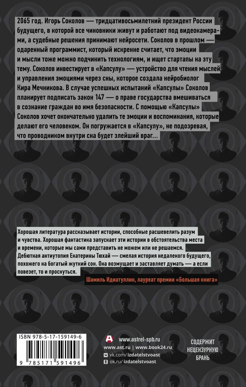 2065 год. Игорь Соколов — тридцативосьмилетний президент России будущего, в которой все чиновники живут и работают под видеокамерами, а судебные решения принимают нейросети. Соколов в прошлом — одаренный программист, который искренне считает, что эмоции и мысли тоже можно подчинить технологиям, и ищет стартапы на эту тему. Соколов инвестирует в «Капсулу» — устройство для чтения мыслей и управления эмоциями через сны, которое создала нейробиолог Кира Мечникова. В случае успешных испытаний «Капсулы» Соколов планирует подписать закон 147 — о праве государства вмешиваться в сознание граждан во имя безопасности. С помощью «Капсулы» Соколов хочет окончательно удалить те эмоции и воспоминания, которые делают его человеком. Он погружается в «Капсулу», не подозревая, что проводником внутри сна будет злейший враг…